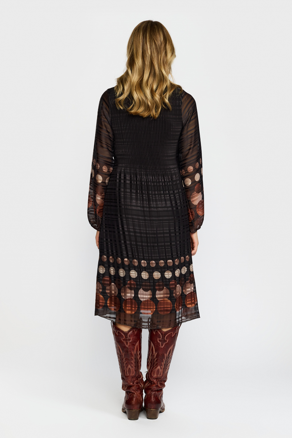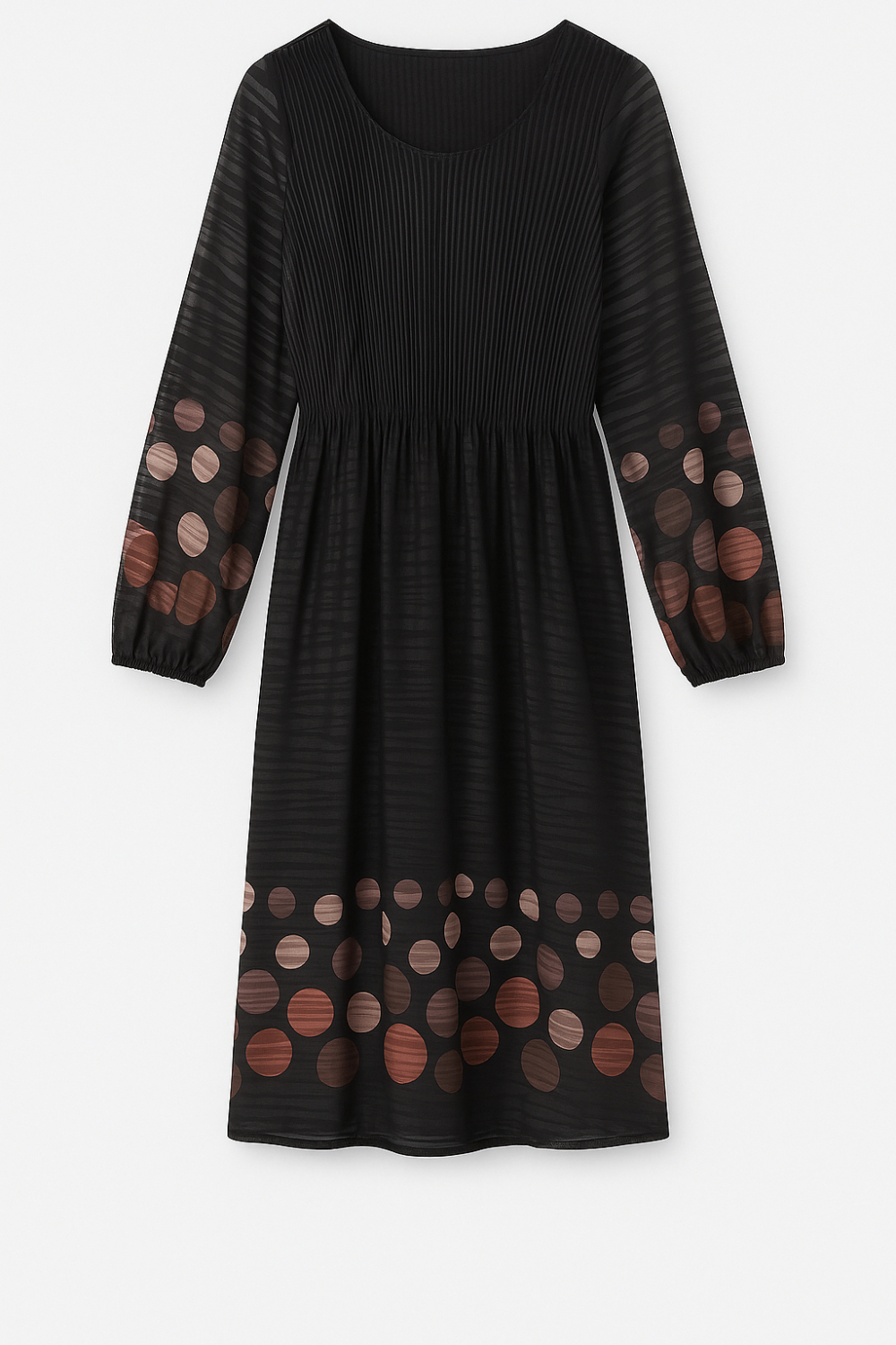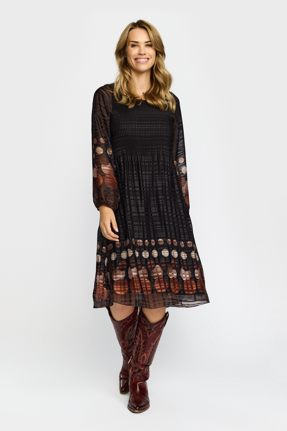 Plissèkjole fra 2 BIZ med lange ermer. Kjolen er i en kvalitet med shimmer med svart bunnfarge og mønster i jordtoner. Flatterende passform med god lengde under knærne. Bruk kjolen i selskap eller til hverdags med skinnjakke over. Normal til stor i størrelsen.
