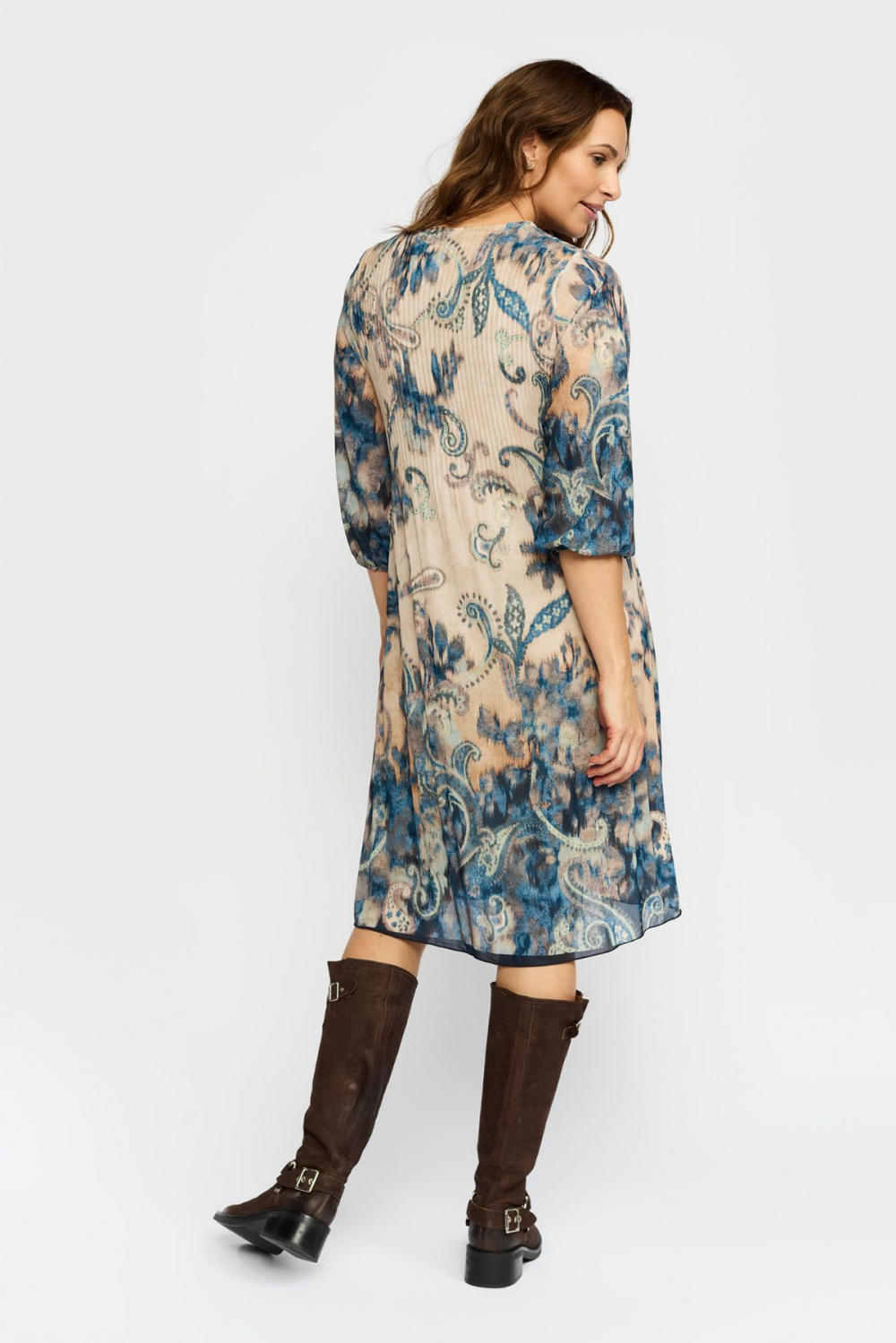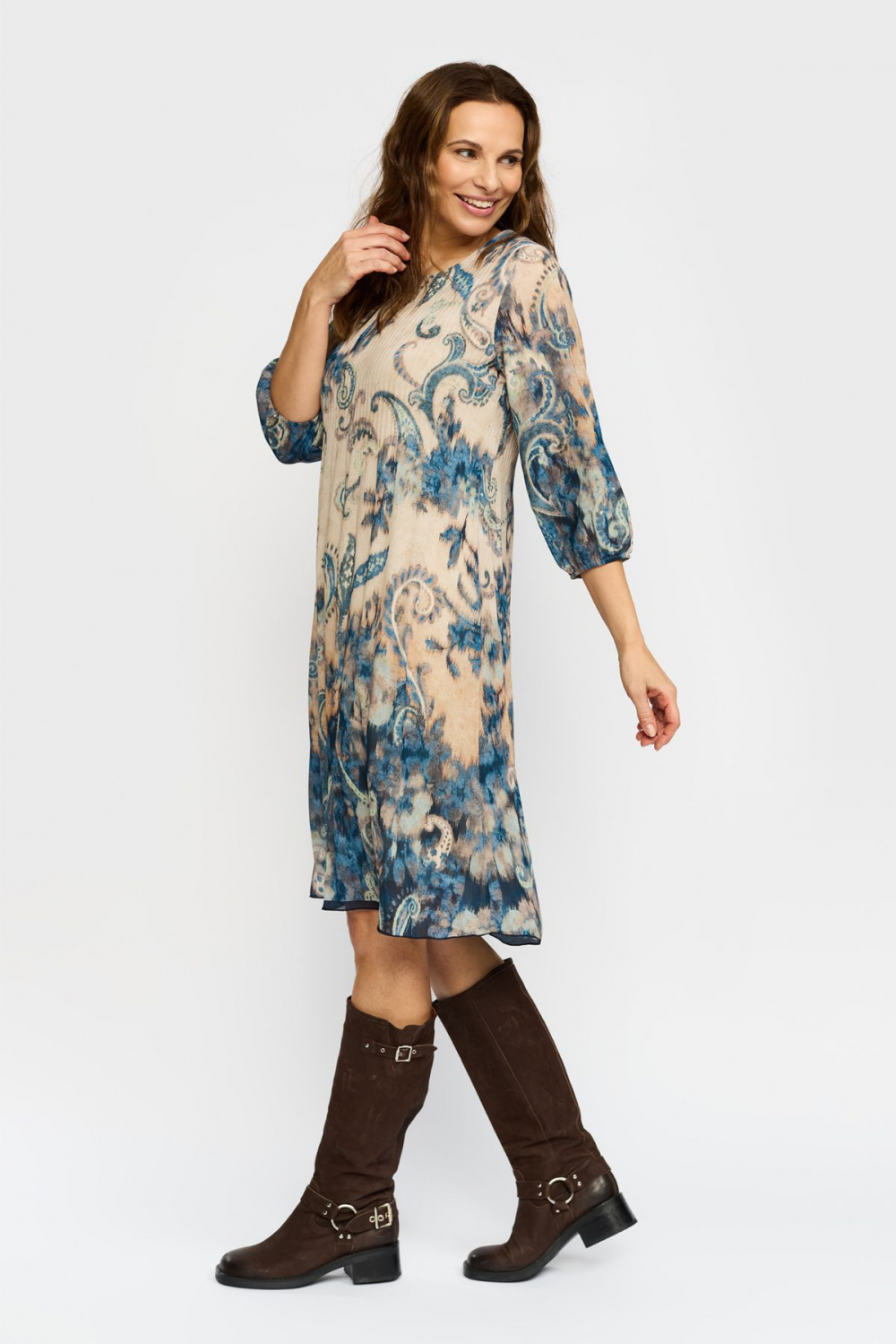 Elegant og behagelig kjole fra 2 BIZ til alle anledninger. Kjolen har rund hals med strikk og 3/4-ermer med strikk nederst. Den har rett passform og rekker nedenfor kneet. Helforet bortsett fra ermene. Normal til stor i størrelsen.
