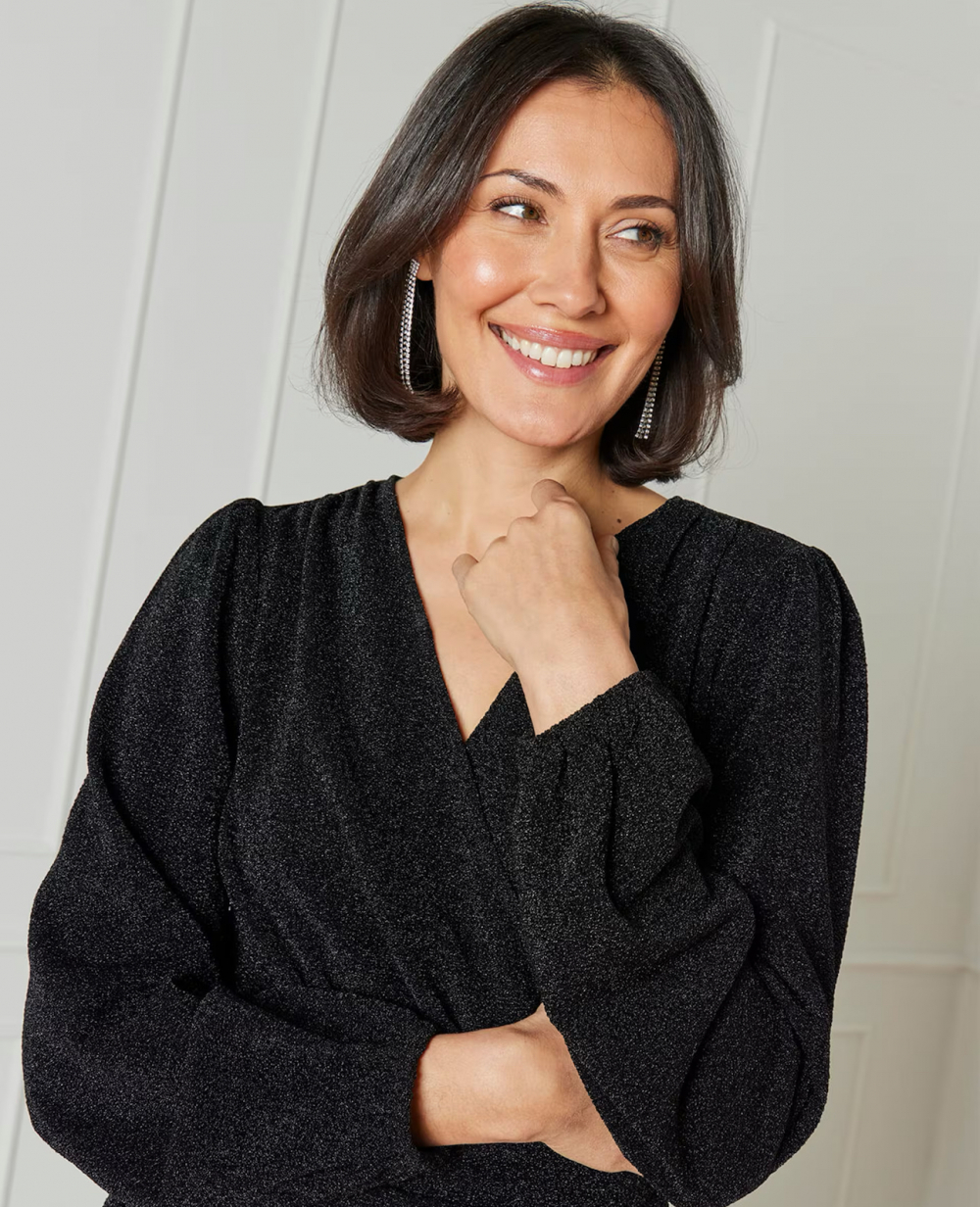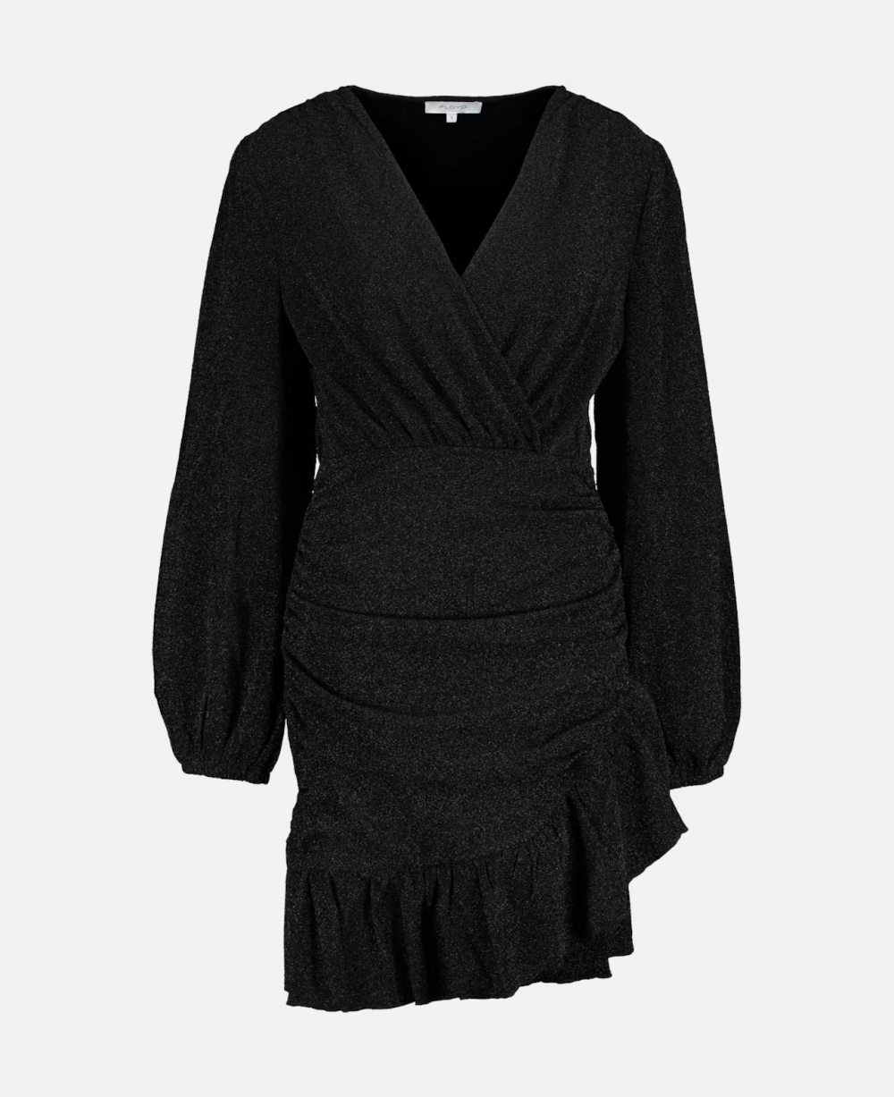 Kort kjole fra Floyd med metalliske tråder som gir den et glitrende utseende. Den har omslag med v-utringning med lange volumiøse ermer med strikk i kanten. Kjolen har ettersittende passform med volang nede på skjørtet. Den har legg nedover begge sidene i skjørtet som skaper draperinger og gir en flatterende siluett. Det er god stretch som gir en behagelig passform. Normal i størrelsen.