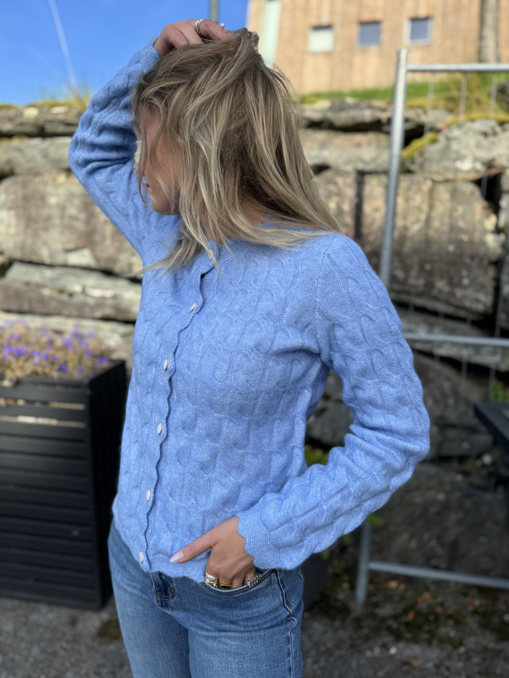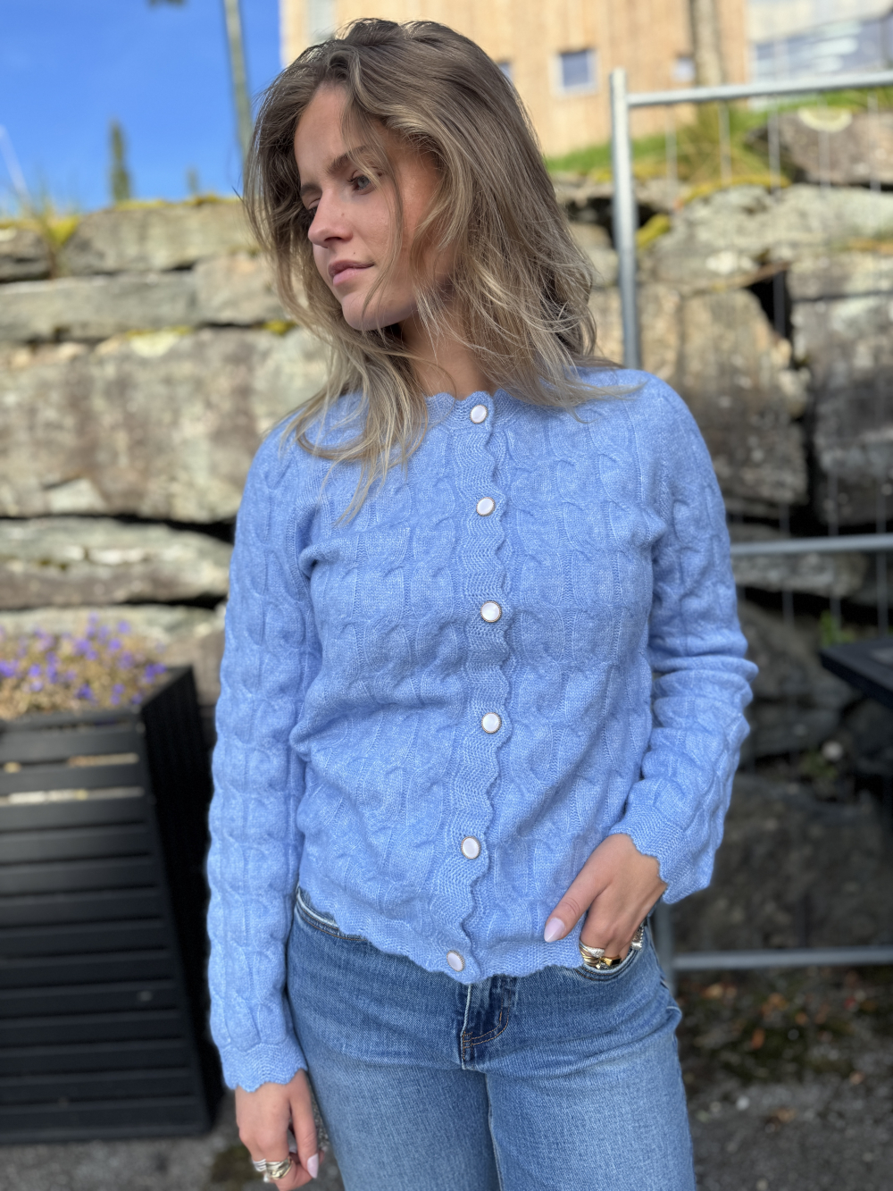 Cardiganjakke fra YAS med ullblanding i kabelstrikk. Jakken har rund hals, lange ermer og lukkes med dekorative knapper foran. Den er rett i fasongen og normal i størrelsen. Hedda er 165 cm og har str. XS.