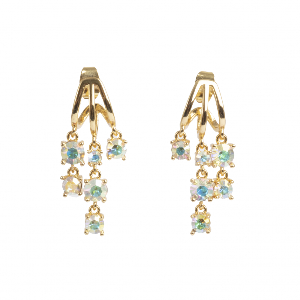 Disse elegante øredobbene kombinerer klassisk gulltone med et lekent og glitrende uttrykk. Øredobbene består av små hengende steiner med en skimrende, regnbueaktig overflate som fanger lyset vakkert fra alle vinkler.