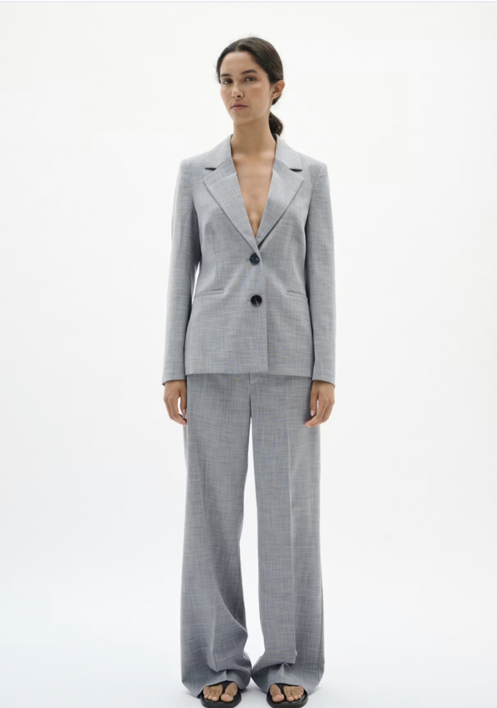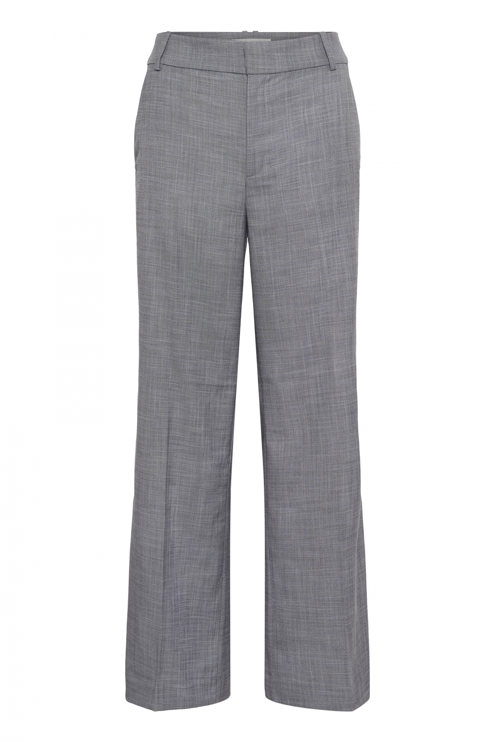 En klassisk og stilren dressbukse fra InWear i en lysegrå melert farge. Buksen har rette, vide ben og et tidløst uttrykk. Den har linning som lukkes med hempe, knapp og glidelås. Stikklommer i siden. Match den til Cadie Blazer for komplett drakt. Normal i størrelsen.