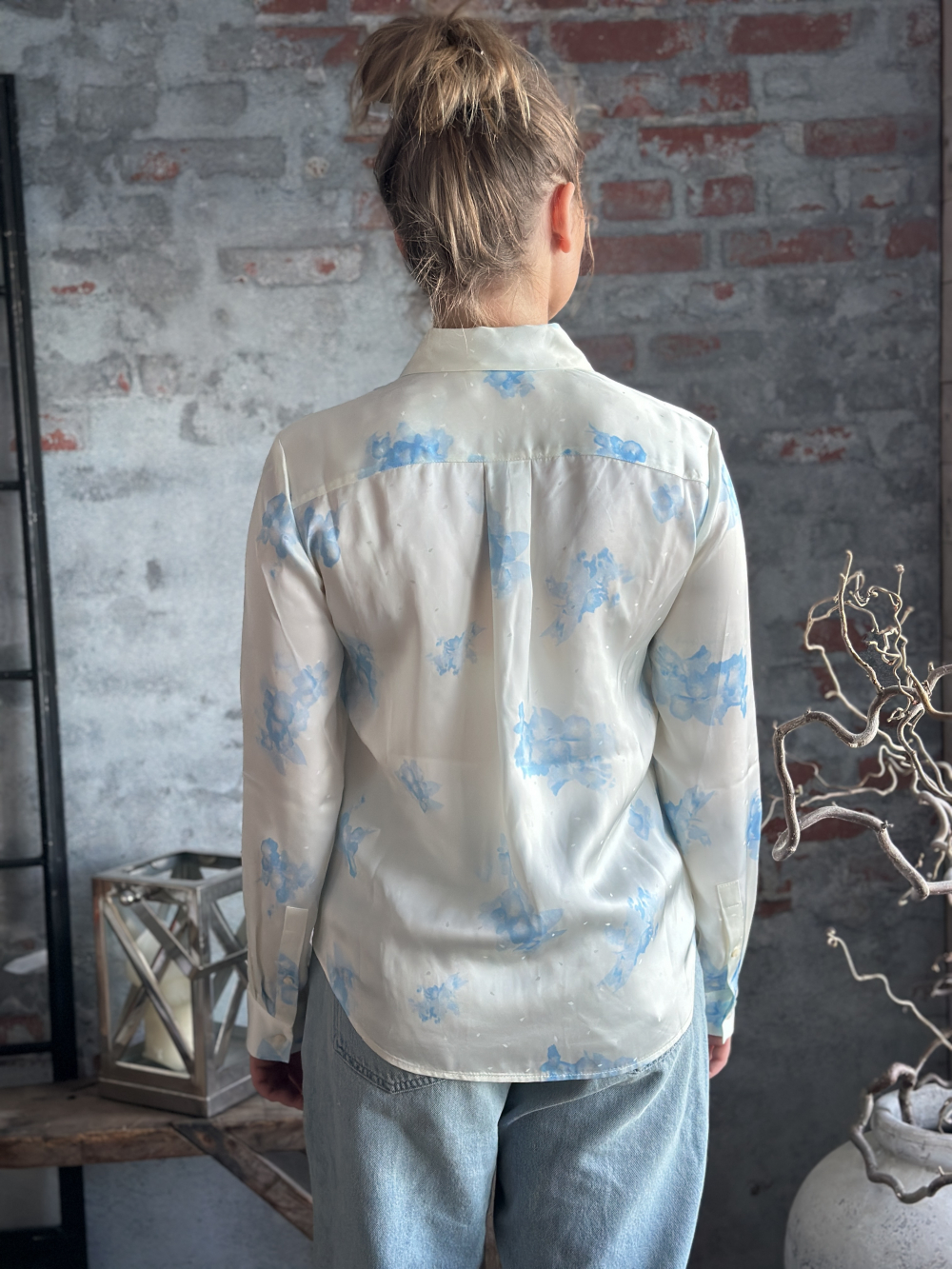 Dette er en elegant og feminin skjorte med et lett og sofistikert uttrykk. Skjorten har en klassisk krage og knappelukking i front som gir et tidløst preg, mens det delikate blå mønsteret på off white bunn tilfører et mykt og moderne uttrykk. Stoffet har en lett glans som gir en eksklusiv følelse og et pent fall. Passformen er rett og behagelig med lange ermer og mansjetter som kan styles både oppkneppet og lukket. Skjorten passer like godt til dressbukser og skjørt som til jeans, og er et allsidig plagg som fungerer både til jobb og mer pyntede anledninger.