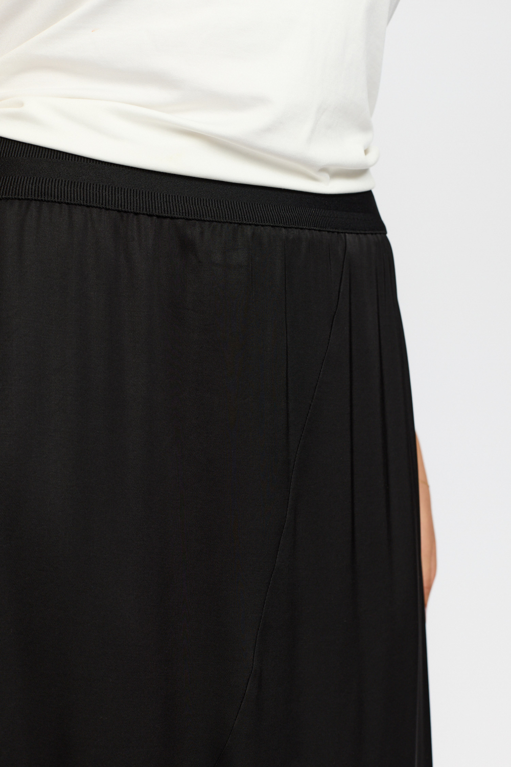 Langt satengskjørt fra 2BIZ med strikk i linningen. Skjørtet er smalt over hoftene og faller elegant i en liten a-fasong og har en diagonal søm foran. Skjørtet er like fint til hverdags sammen med en strikk eller til festlige anledninger med bluse til. Normal i størrelsen.