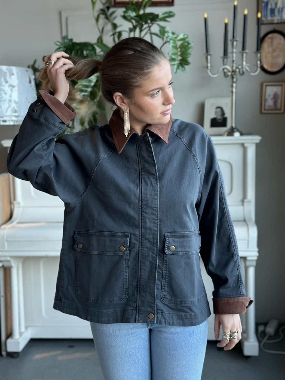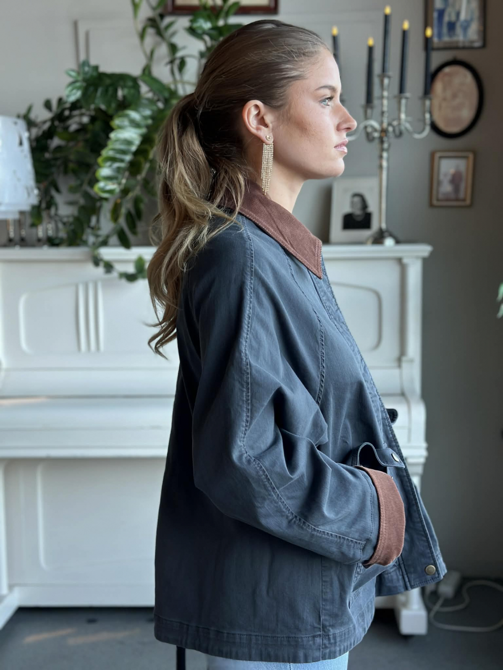 Carlina Jacket er en avslappet og stilren hverdagsjakke med et moderne, lett oversized uttrykk. Den myke bomullskvaliteten, kombinert med kontrastfarget krage og mansjetter, gir et tidløst, men samtidig urbant preg. Jakken har praktiske frontlommer samt glidelås skjult bak knappestolpe. Perfekt for lag på lag og for en uanstrengt, cool stil gjennom hele sesongen.