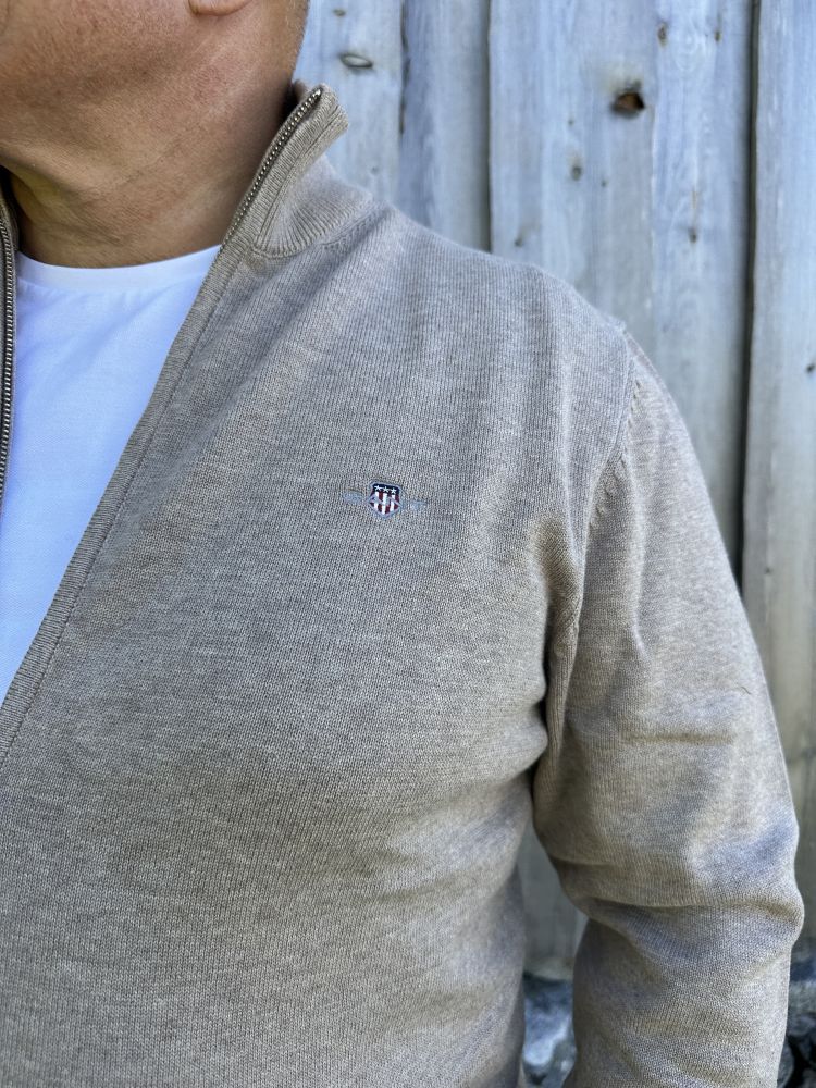 Finstrikket cardigan i bomull fra Gant. Cardigan har krage og lukkes med toveis glidelås foran. Ribbestrikket krage og nederst på ermene og rundt livet. Liten brodert Gant-logo på brystet. Den er rett i passformen og normal i størrelsen.