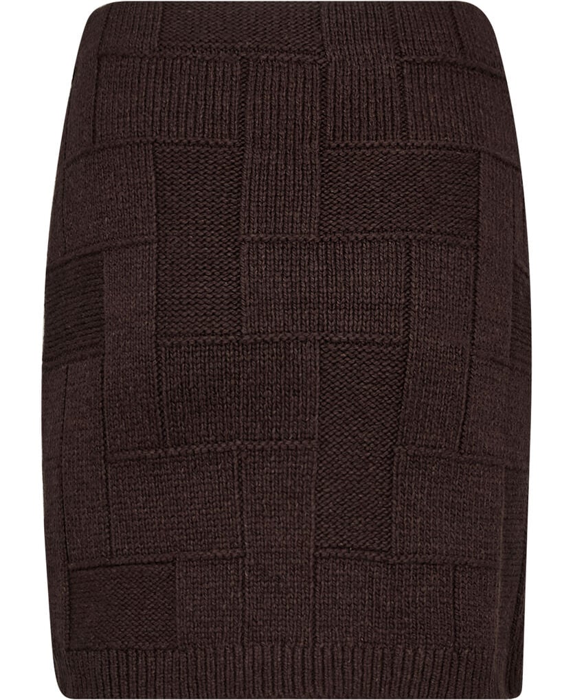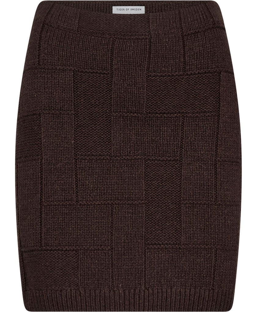 Elegant brunt skjørt i myk strikk med grafisk rutemønster. Skjørtet har en kroppsnær passform og elastisk midje som gir både komfort og stil. Perfekt å kombinere med en enkel topp eller Marie Triumph Steel genser som sett.
