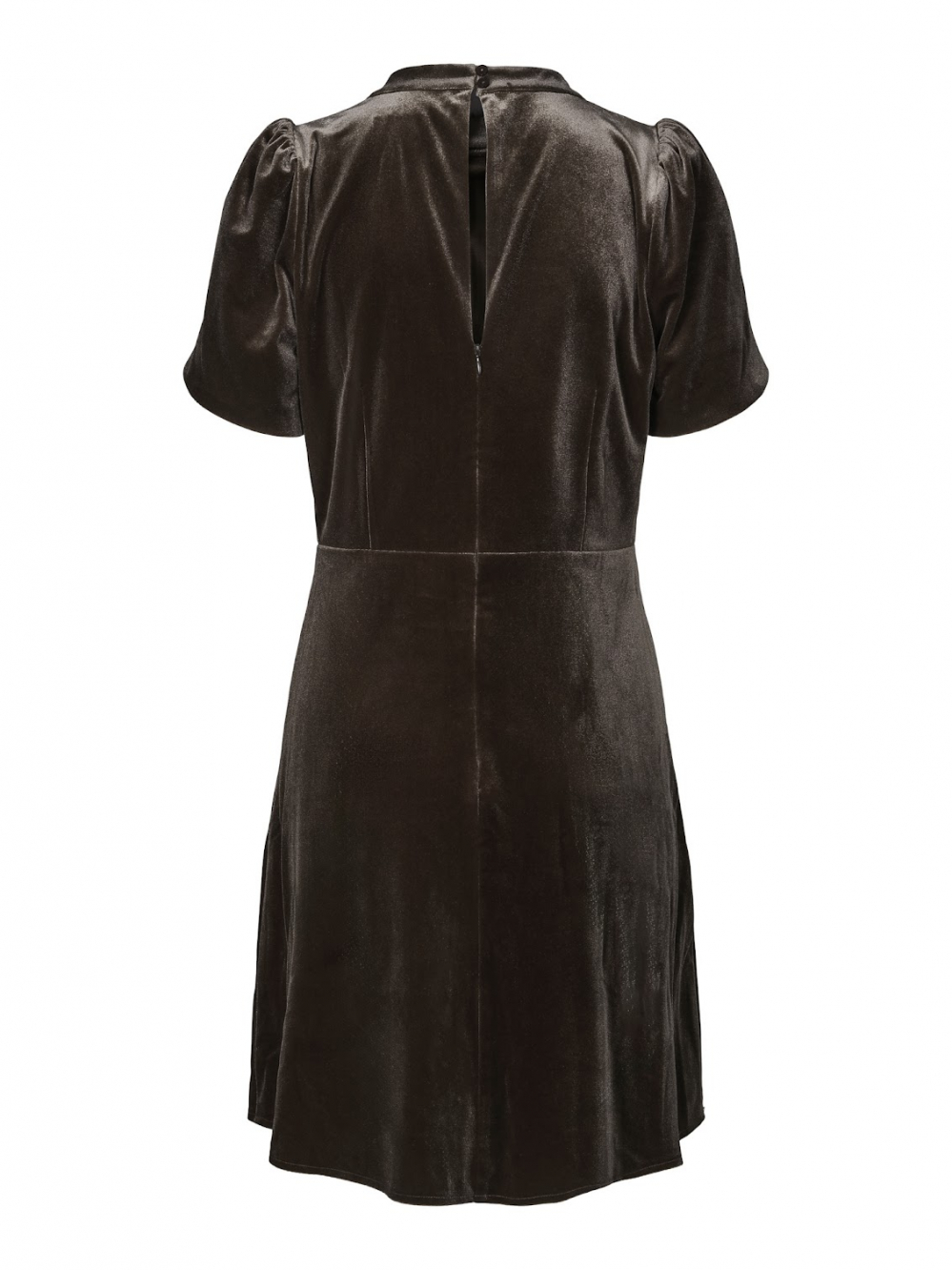 Kort kjole i velur fra Ricco Vero i nydelig grønntone. Kjolen har en fin siluett med søm i midjen. En liten turtleneck - hals og puffermer som er løse og rekker ned til albuen. Skjørtet er i A - fasong. Normal i størrelsen.