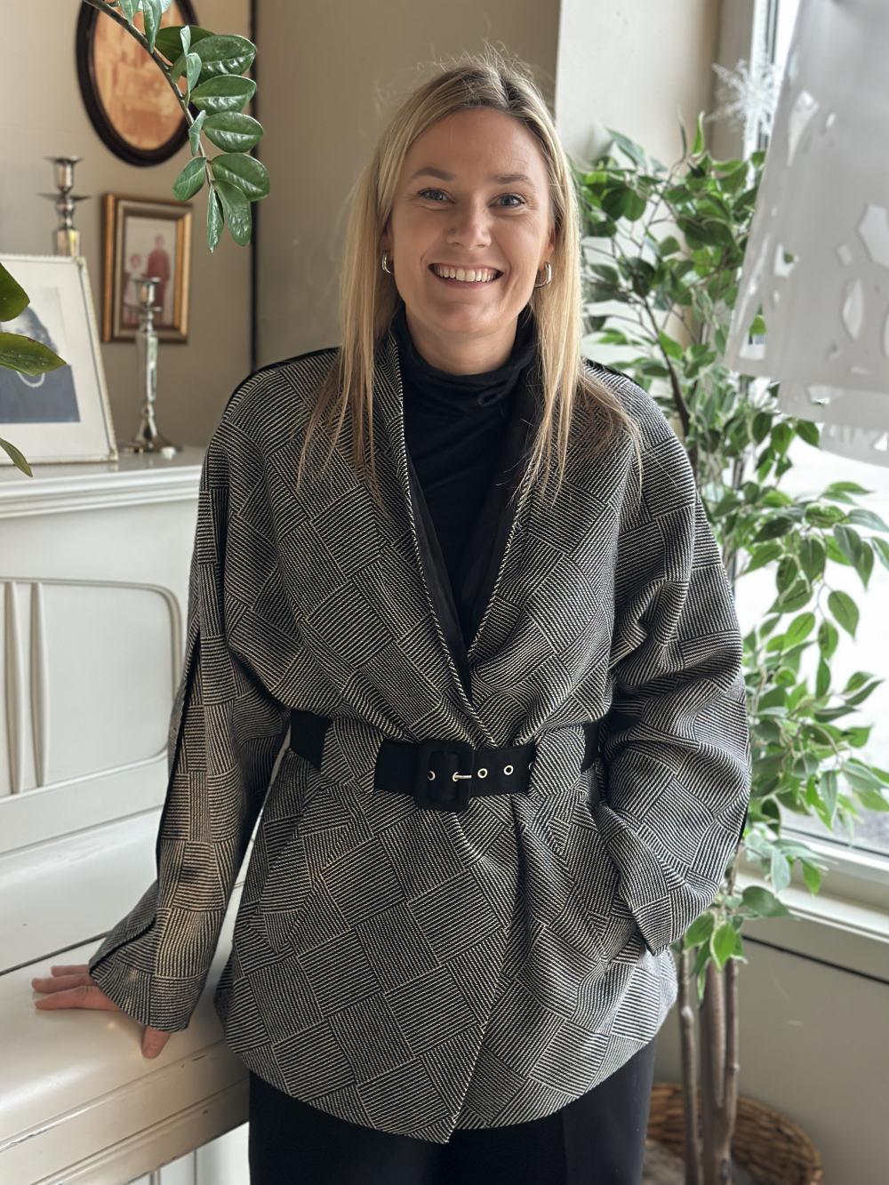 Chey Jacket fra YAS er en unik jakke med tøffe detaljer! Stilig jakke som styles til sorte bukser eller skjørt til fest, eller til jeans i hverdagen. Rett og noe oversized fasong, og vide ermer. Avtagbart belte i midjen som skaper en fin silhuett. Tidløs farge i sort/hvitt rutete mønster. Fine slag i sort fløyel som kan brettes frem.
