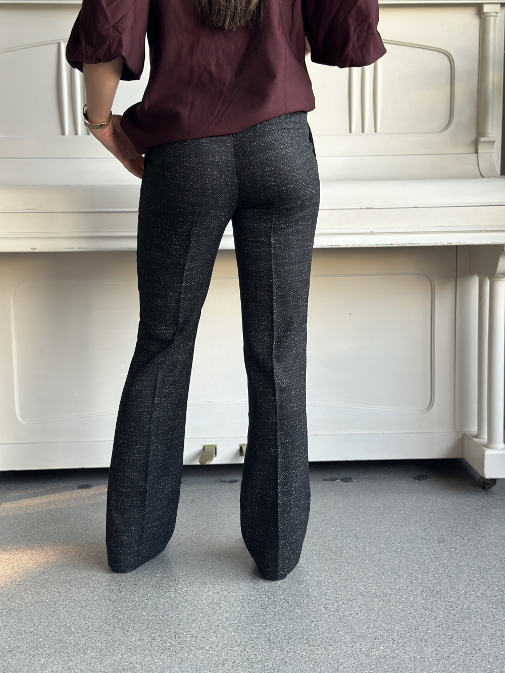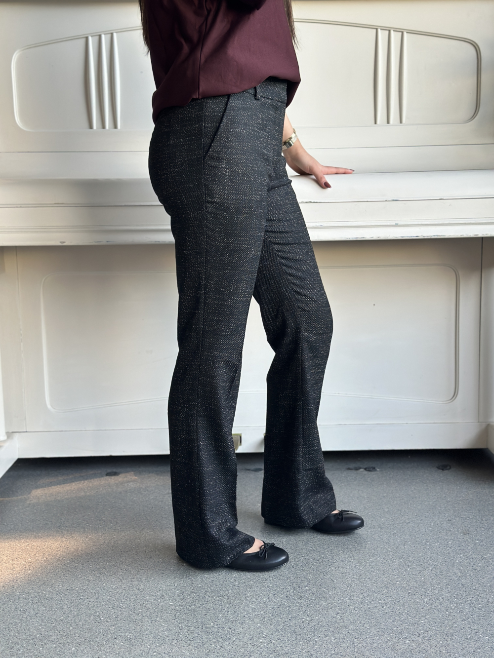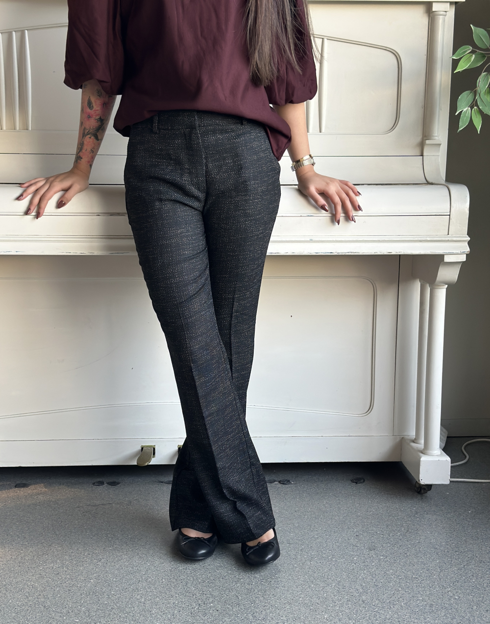 Klassisk dressbukse med bootcut fra FiveUnits i en melert kvalitet. Buksen har stikklommer, sigarettlommer bak og beltestropper. Den er smal i lårene og går ut i en liten sleng fra knærne og ned. Like fin til pumps som til sneakers. Christina er 165 cm og har str. 26.