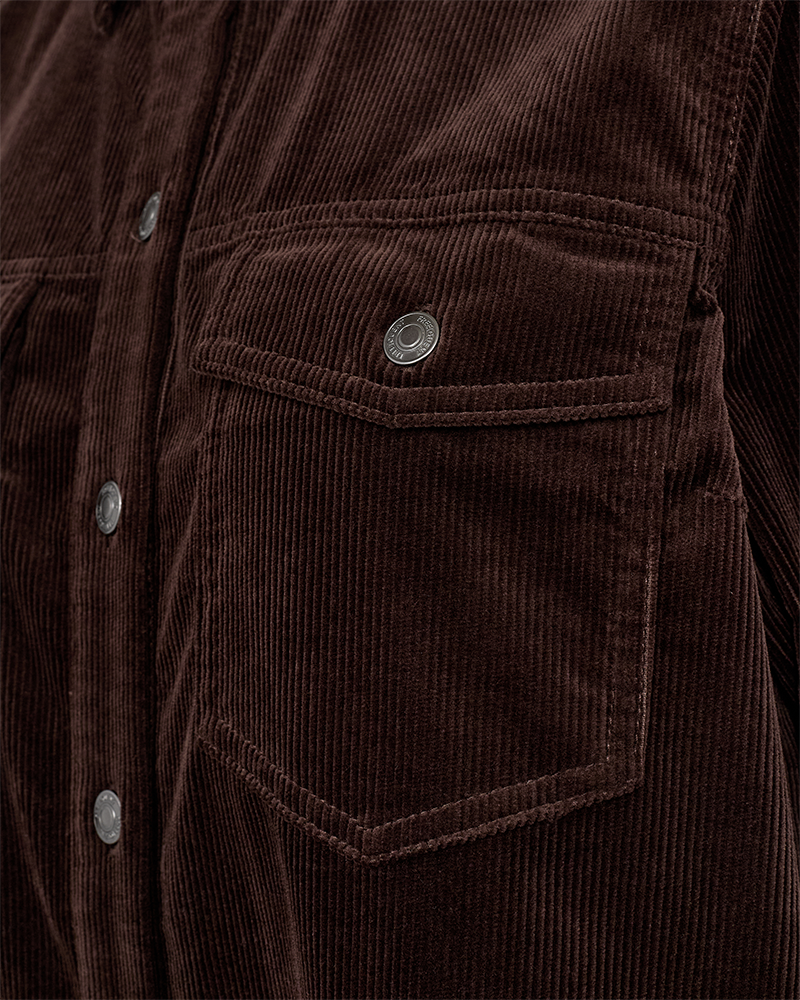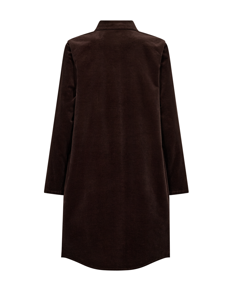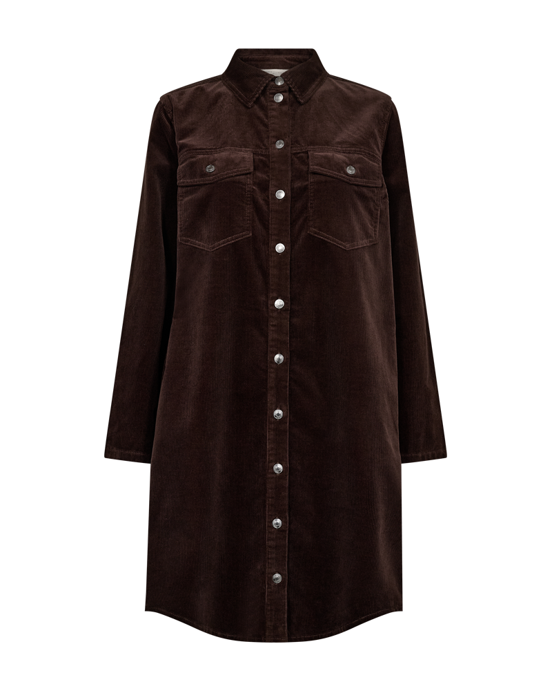 Skjortekjole i cord fra Freequent. Kjolen har rett fasong og stikklommer i sidene. Den lukkes med knapper foran og kan kneppes helt opp. Brystlommer med klaff som lukkes med knapp. Lange, rette ermer. Den rekker til kneet og er lett rundert nederst.