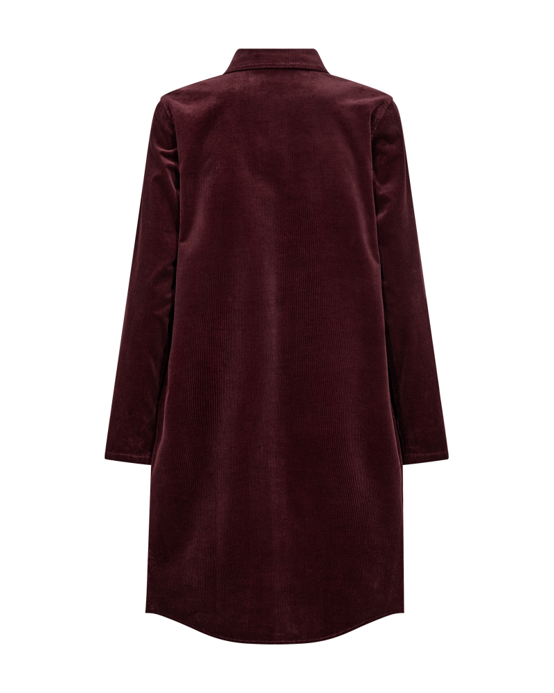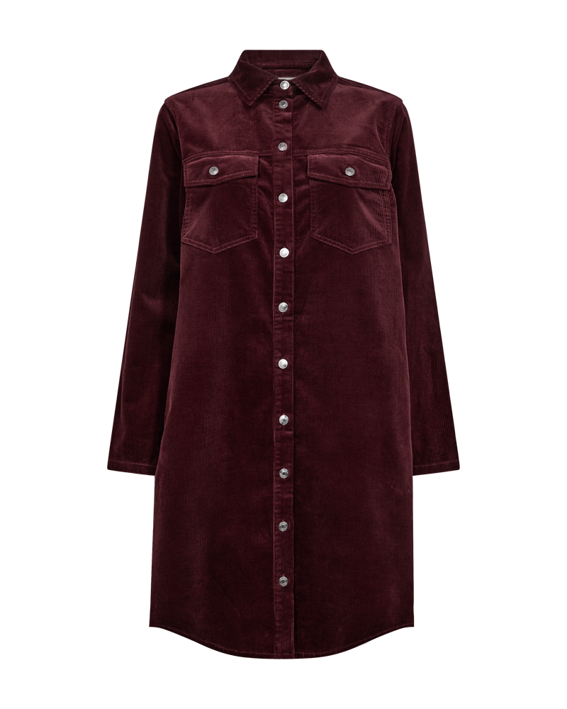 Skjortekjole i cord fra Freequent. Kjolen har rett fasong og stikklommer i sidene. Den lukkes med knapper foran og kan kneppes helt opp. Brystlommer med klaff som lukkes med knapp. Lange, rette ermer. Den rekker til kneet og er lett rundert nederst.