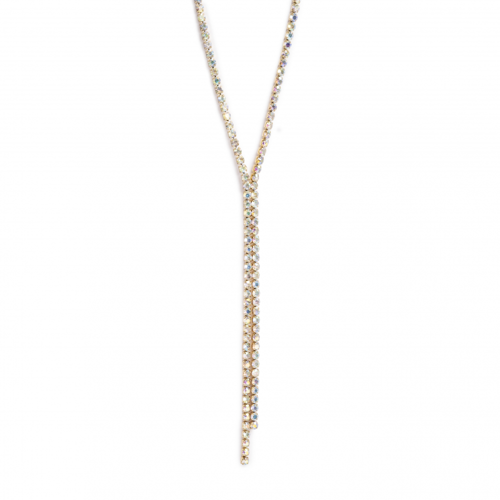 Et elegant og iøynefallende halskjede med moderne Y-design. Smykket er dekorert med glitrende krystaller som reflekterer lyset i nydelige nyanser, festet i en varm gulltone som gir et luksuriøst uttrykk.