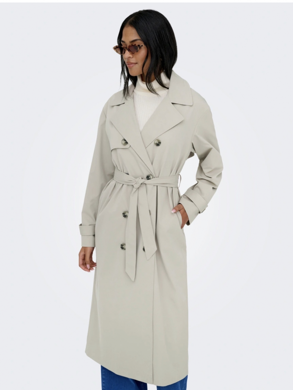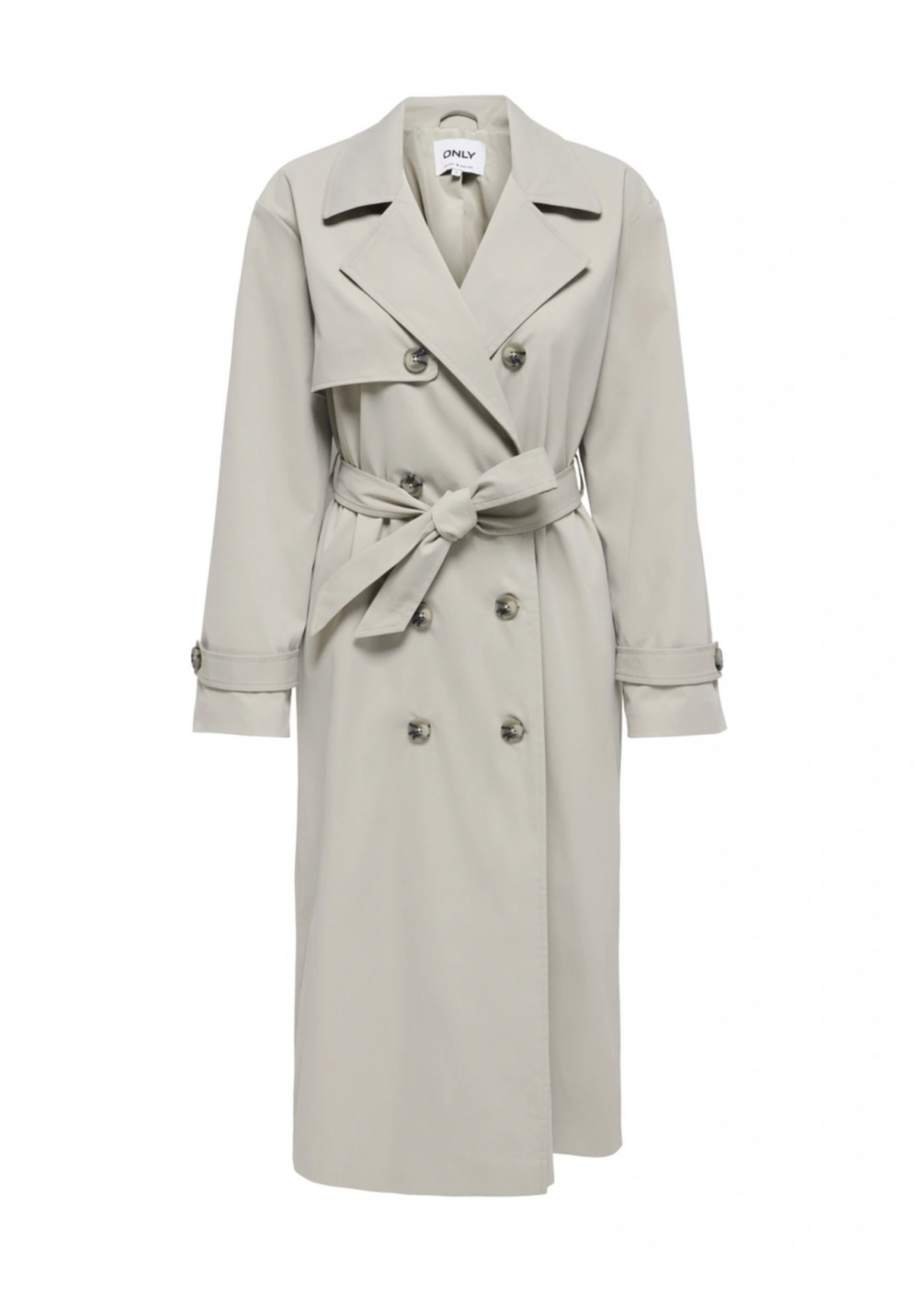 Dobbeltknept lang trenchcoat fra ONLY med tøffe detaljer. Jakken har v-utringning med klassiske slag. Den lukkes med knapper. Mansjettene kan justeres med knapper. Belte i samme kvalitet følger med og gir jakken et feminint snitt. Normal i størrelsen.