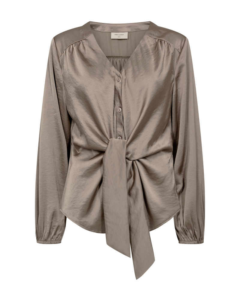 Bluse i sateng fra Freequent. Blusen har rett passform med flaterende knytedetalj i midjen. Den har lange ermer med strikk ved håndleddet. V-hals. Lukkes med knapper foran. Blusen rekker til hoftene. Blusen er litt stor i størrelsen.