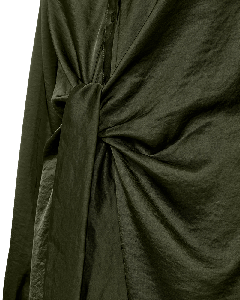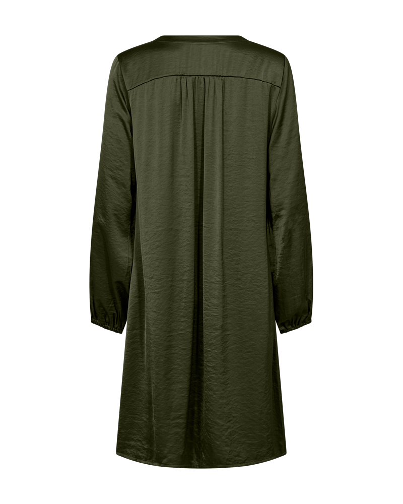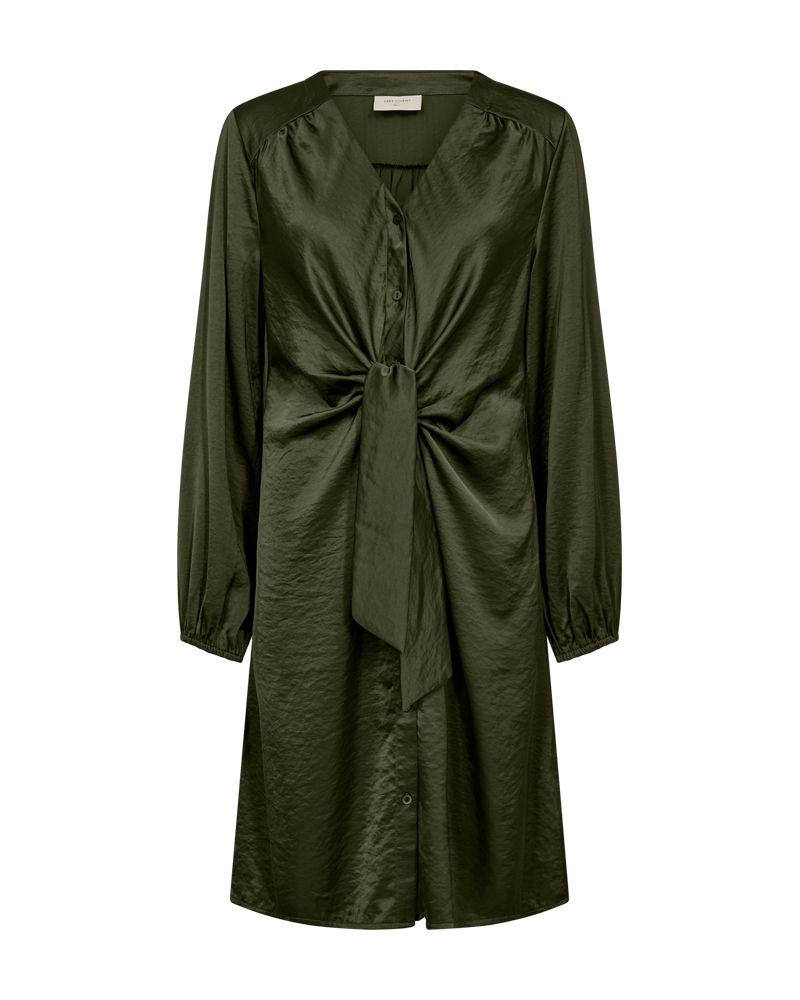 Kjole i sateng fra Freequent. Kjolen har rett passform med flaterende knytedetalj i midjen. Den har lange ermer med strikk ved håndleddet. V-hals. Lukkes med knapper foran. Kjolen rekker til kneet. Kjolen er litt stor i størrelsen.