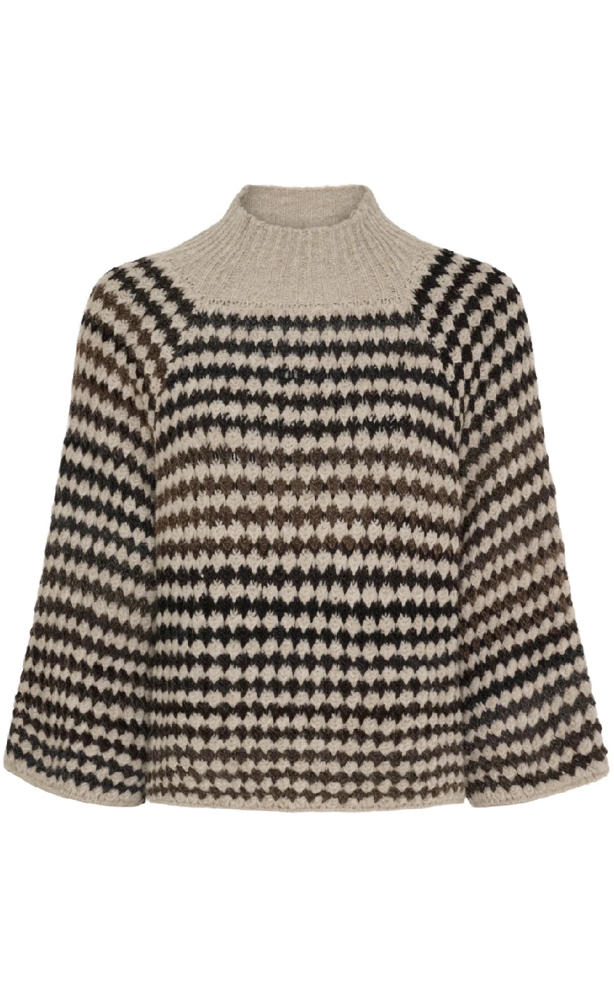 En myk og trendy strikkegenser fra Marta Du Chateau med et vakkert mønster i varme jordtoner. Fatima-genseren har en løs og behagelig passform med høy hals og vide ermer som gir et moderne uttrykk. Den perfekte kombinasjonen av komfort og stil, like fin til hverdags som til en mer pyntet anledning.