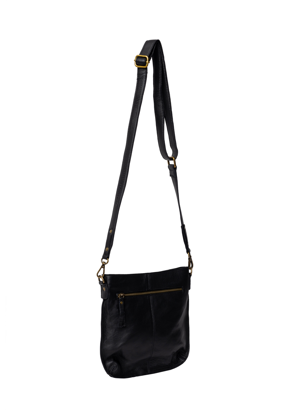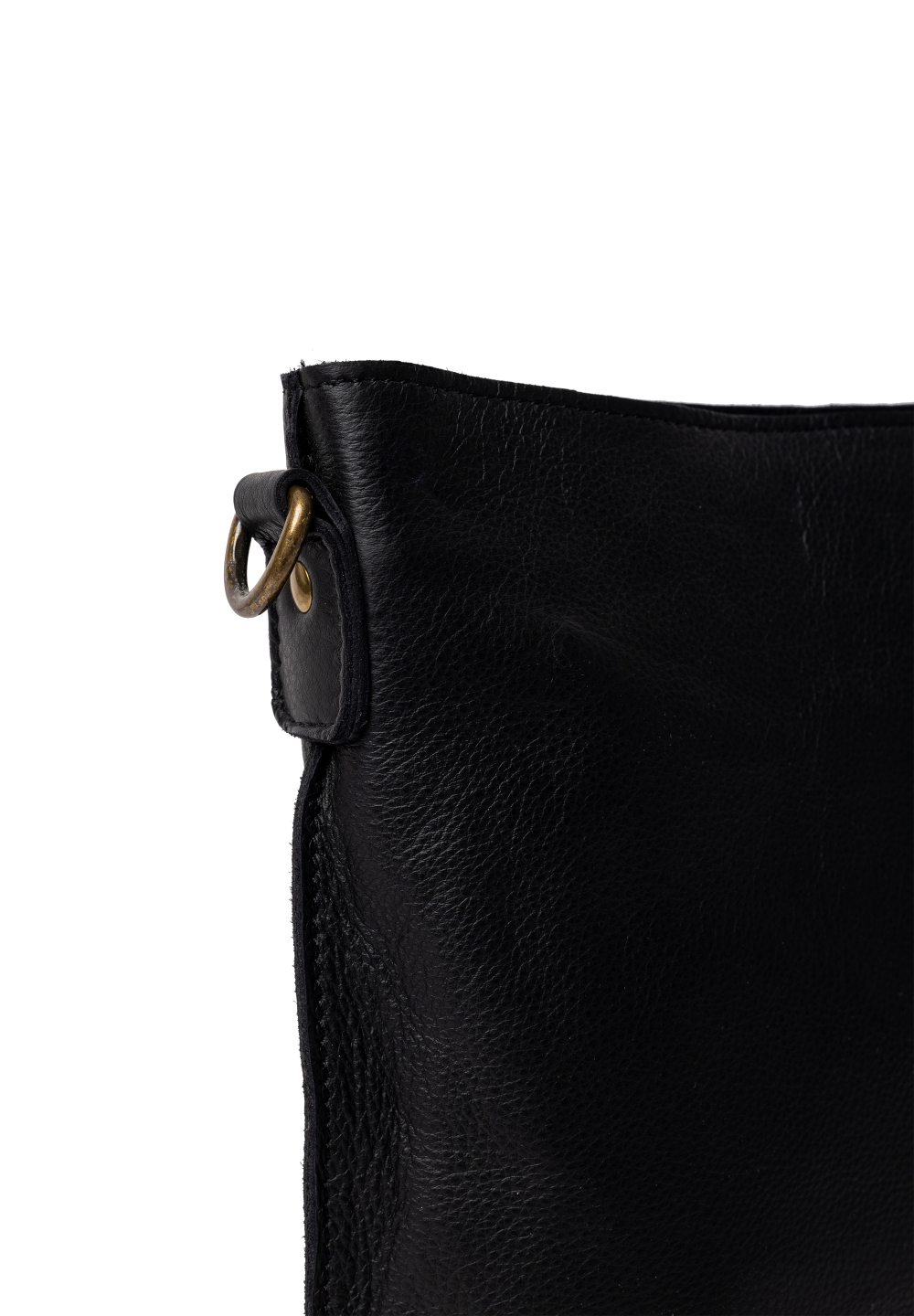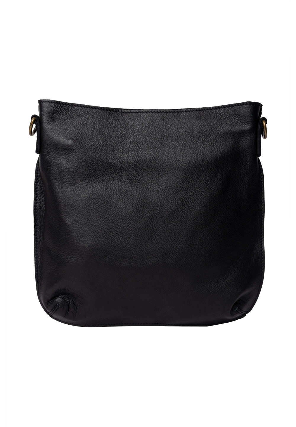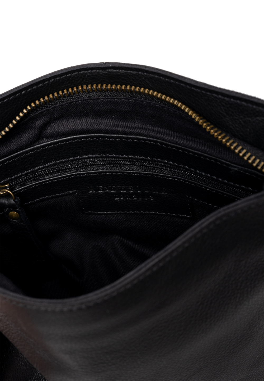 Tidløs skinnveske fra Redesigned. Vesken lukkes med glidelås i toppen. To mindre rom inni, ett med glidelåslukking. Den har også rom med glidelåslukking utenpå. Avtagbar og justerbar skulderrem. Totebag inkludert.