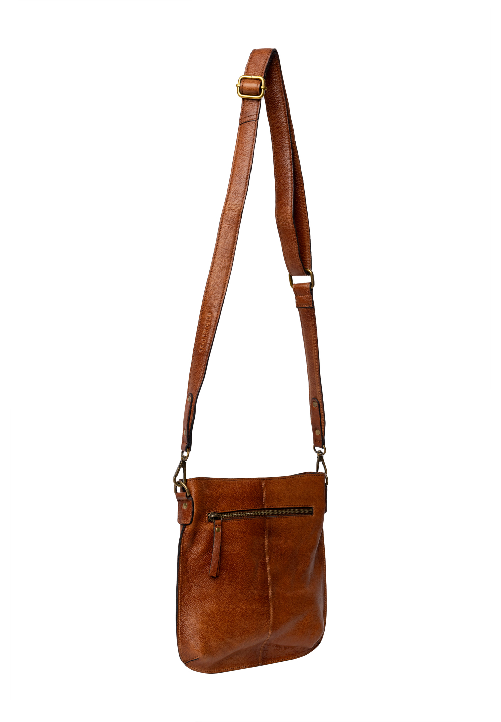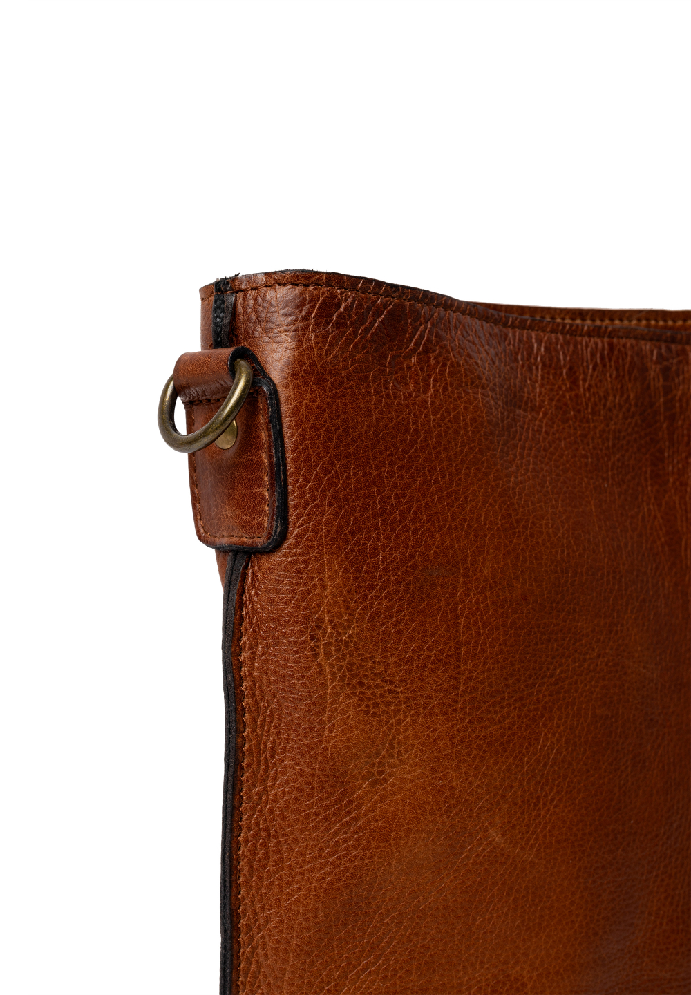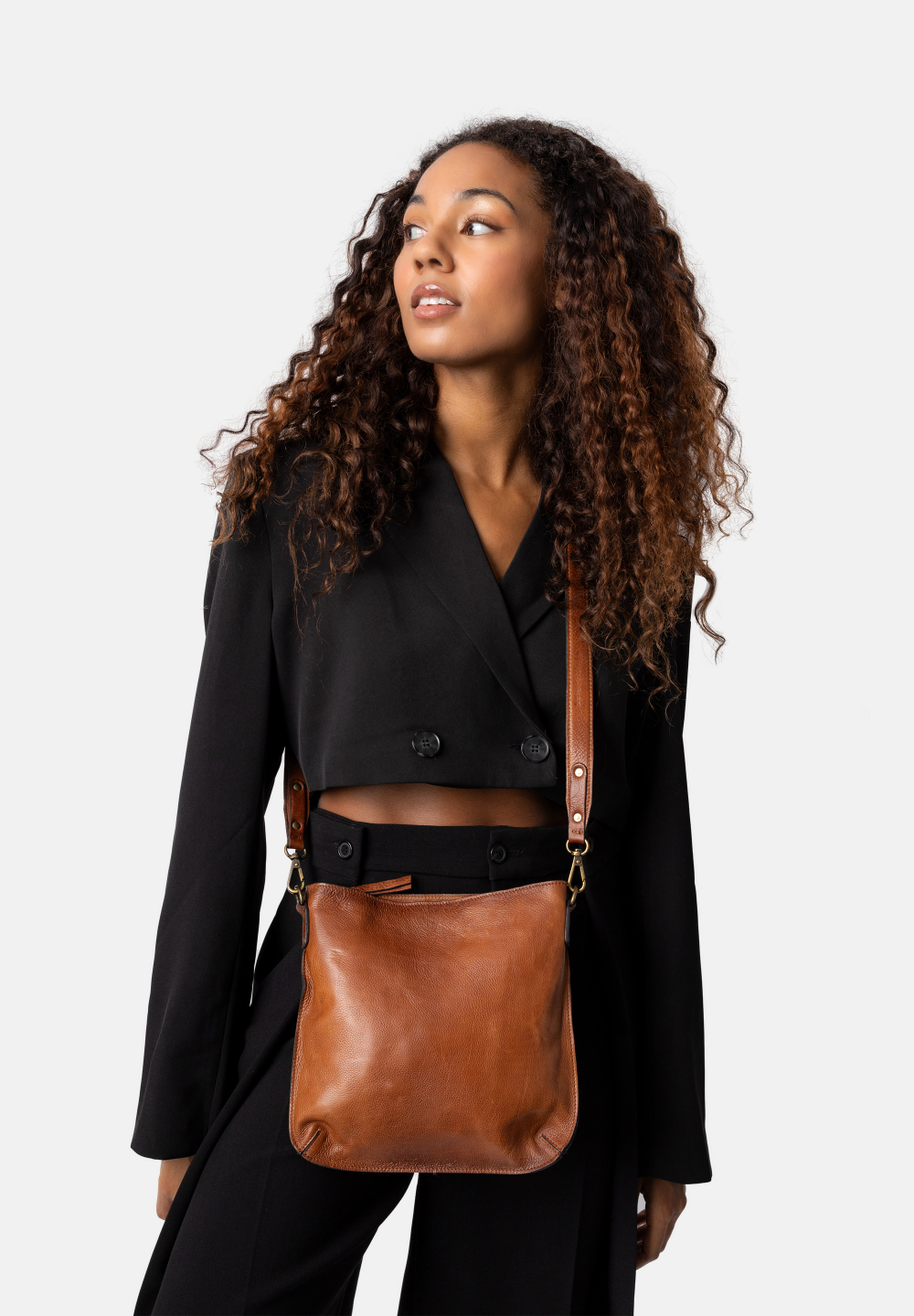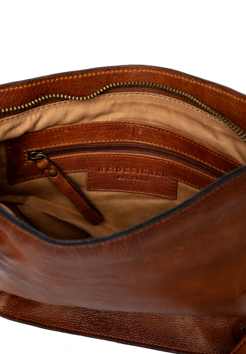 Tidløs skinnveske fra Redesigned. Vesken lukkes med glidelås i toppen. To mindre rom inni, ett med glidelåslukking. Den har også rom med glidelåslukking utenpå. Avtagbar og justerbar skulderrem. Totebag inkludert.