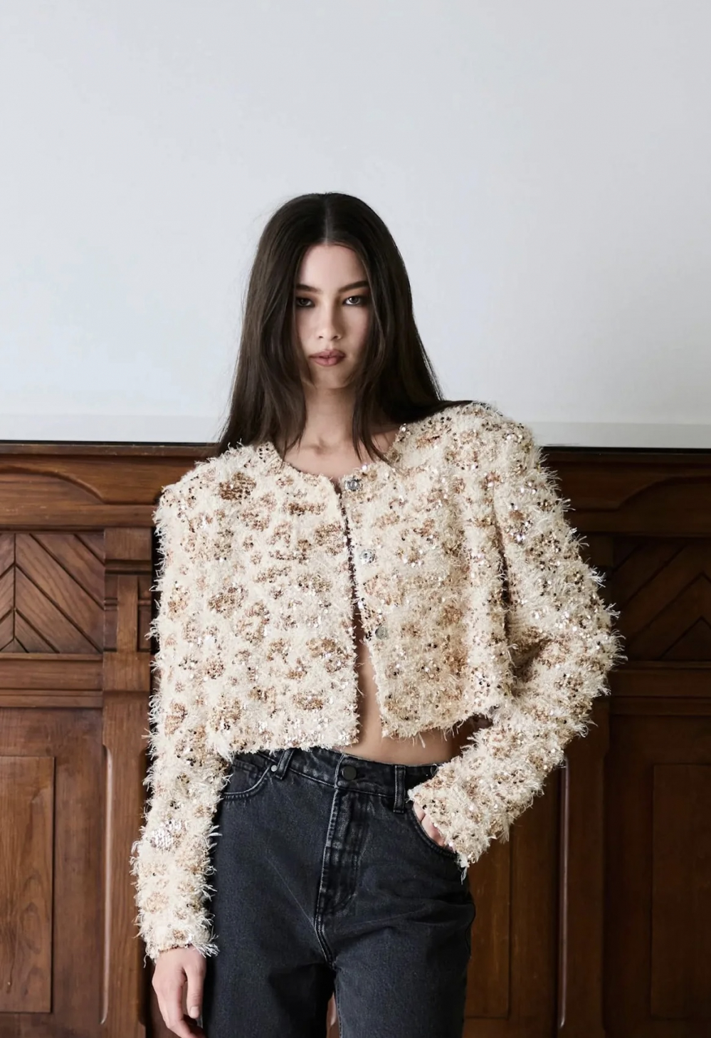 Bolerojakke fra Iben i sttilig design med detaljer som legges merke til. Jakken har rund hals, lange ermer og rekker til midjen. Den lukkes med hemper i front. Off - white bunn med paljetter i gulltoner. Like fin til bukse og skjørt som over kjole. Normal i størrelsen.
