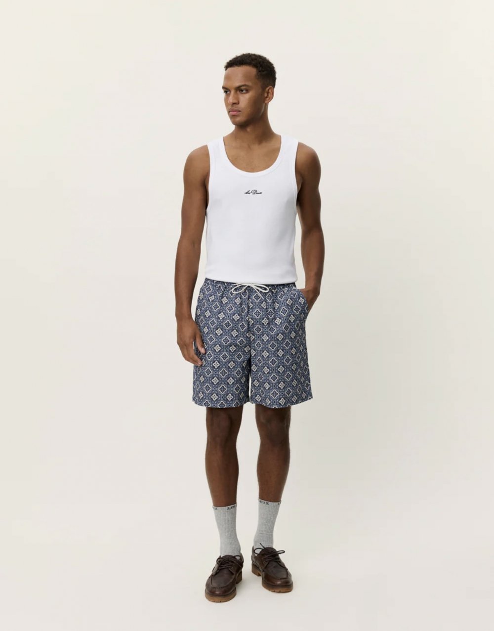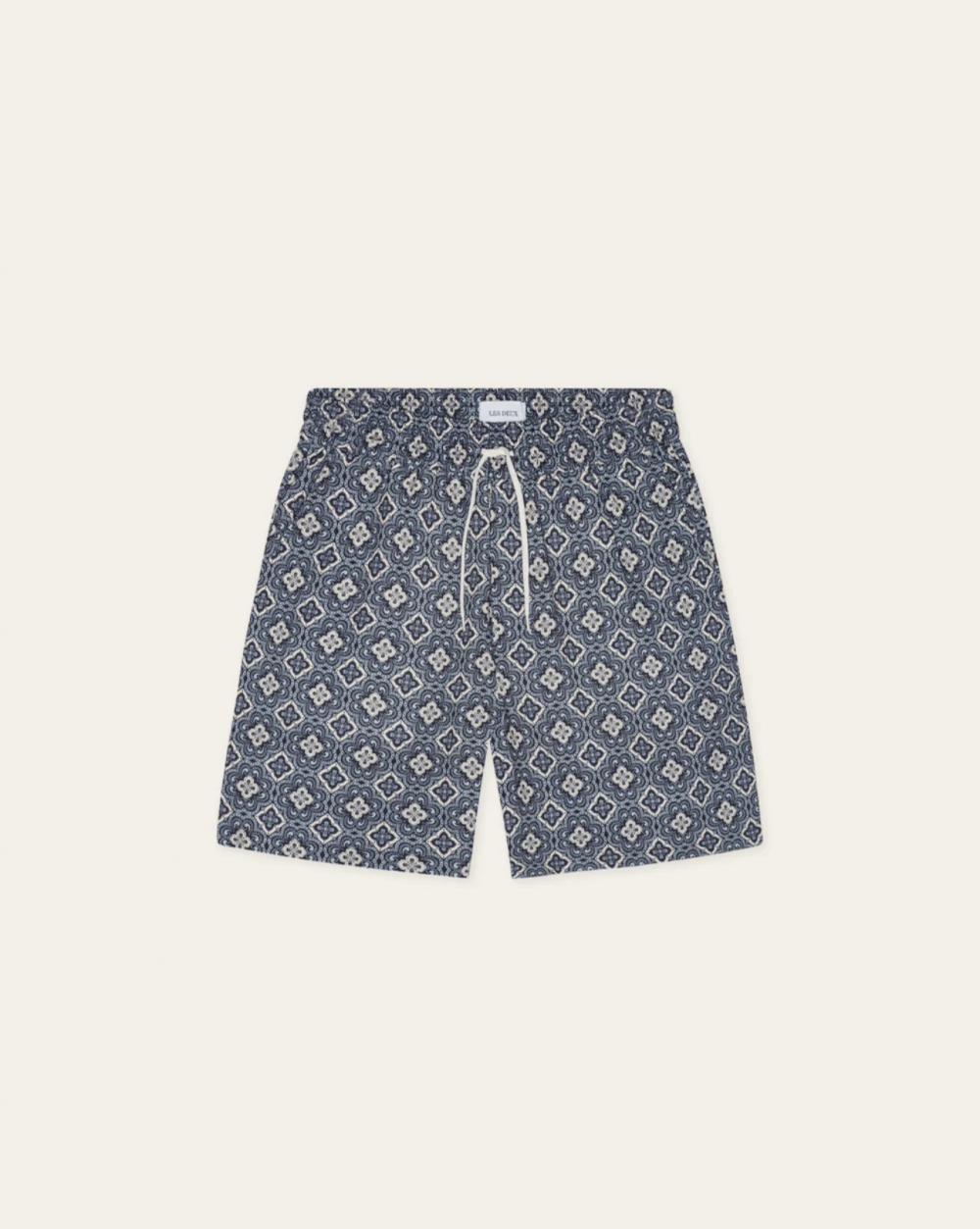 Harry er en lett og behagelig shorts fra Les Deux. Printet i mørkeblå gir skikkelig retrovidder og sammen med Lukas Shirt har du et komplett sett. Shortsen har elastisk linning med snøre. Lommer i siden. Normal i størrelsen.