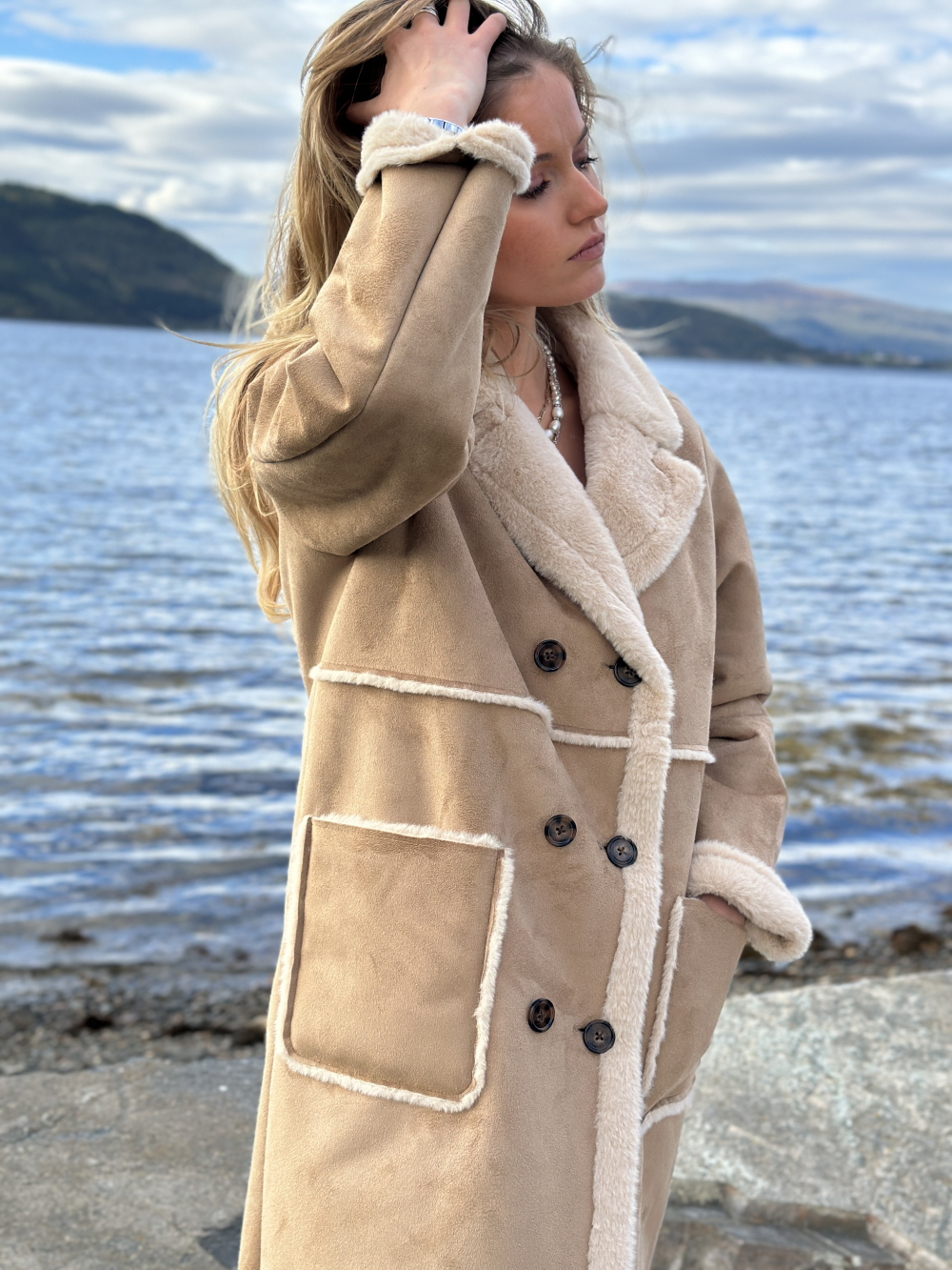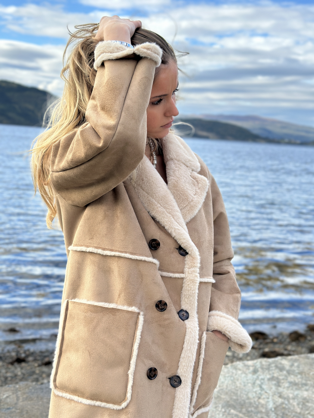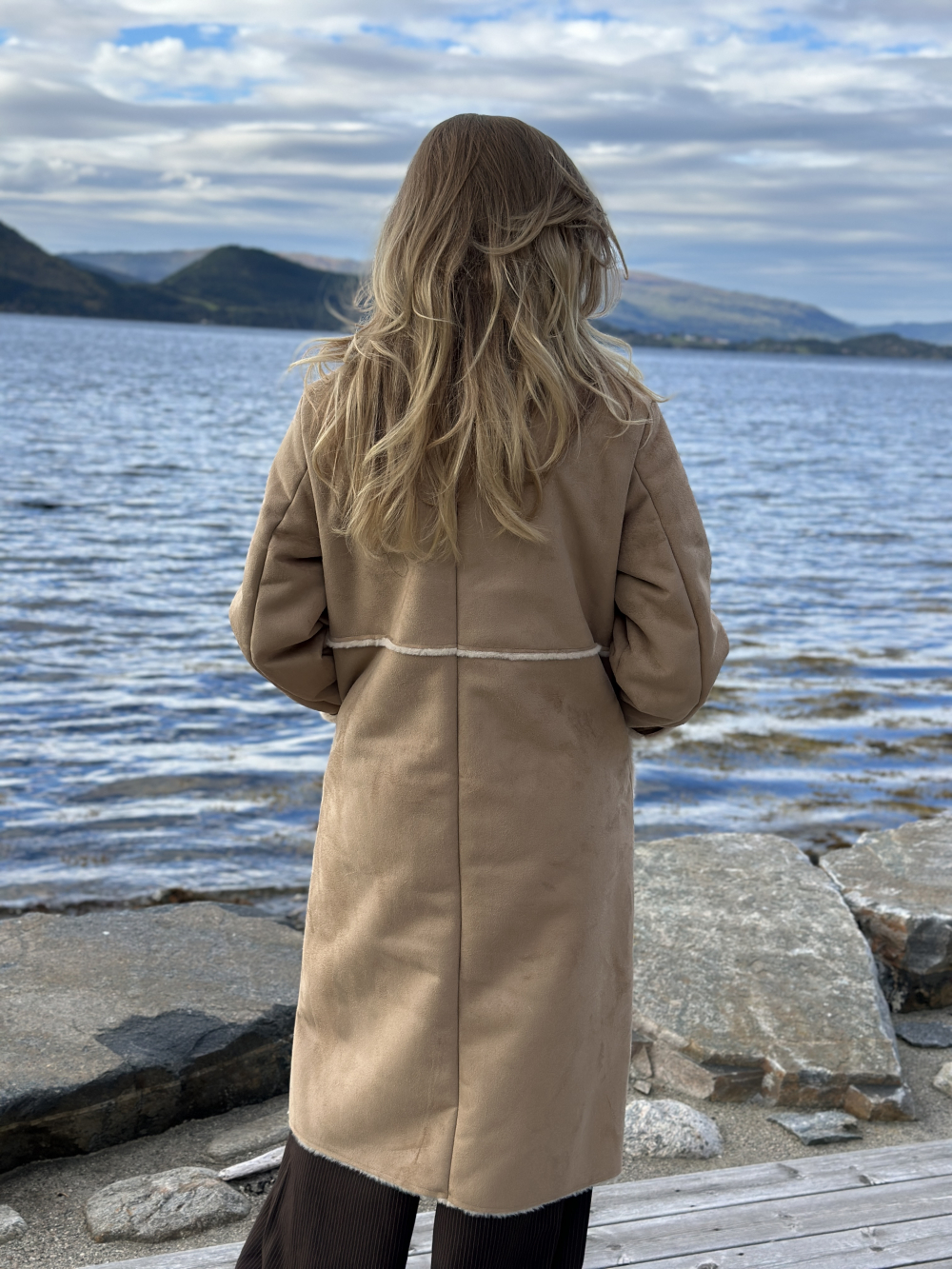 Lang ytterjakke fra Freequent i mykt imitert semsket materiale. Jakken har vendte sømmer og er fôret med fuskepels som både varmer og gjør den ekstra trendy. Den er dobbelspent med mørke knapper som gir en fin kontrast. Jakken er rett i fasongen med lommer foran. Normal i størrelsen. Hedda er 165 cm og har str. S