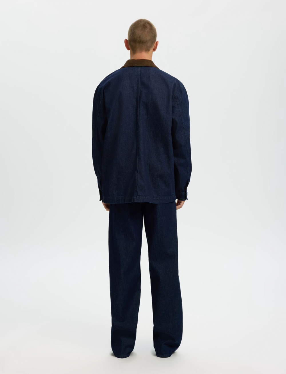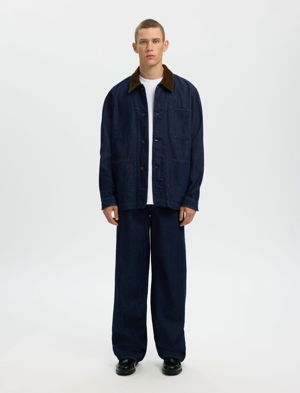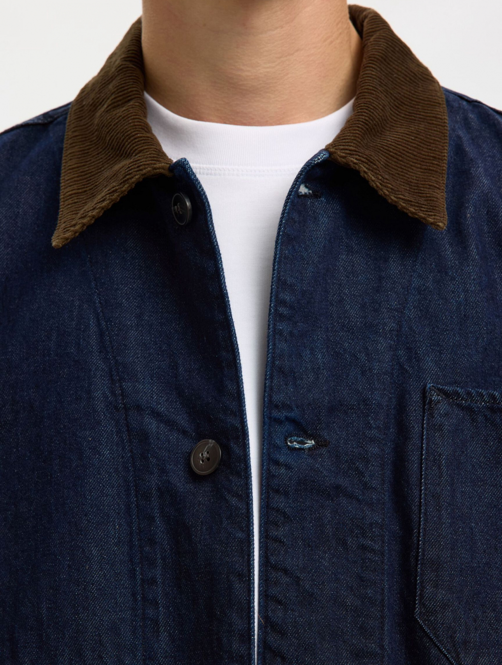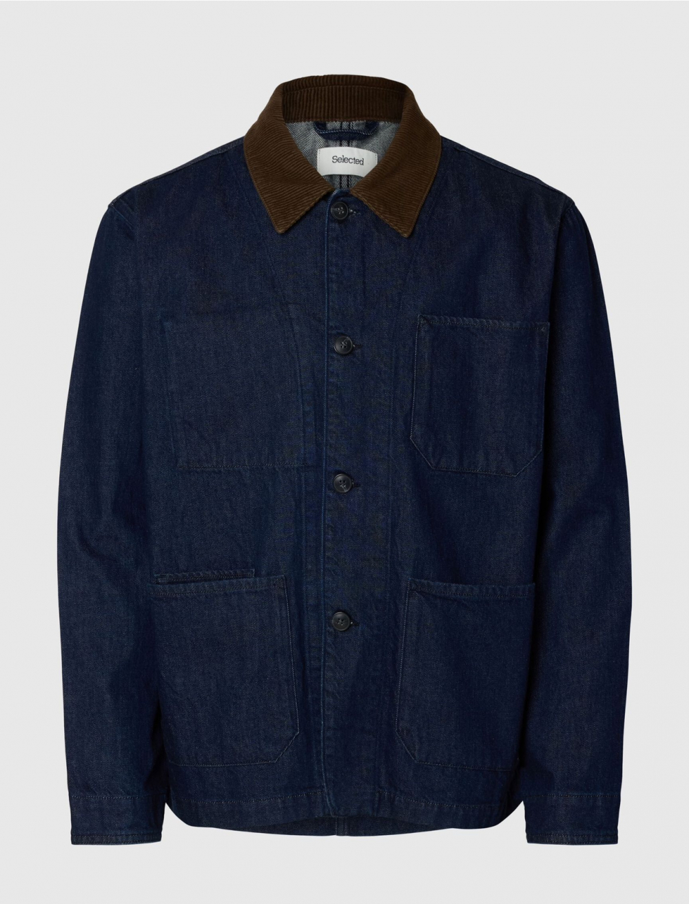 Dongerijakke fra Selected med tøffe detaljer. Jakken er i worker - stil med påsydde lommer i front, i tillegg til bryslomme. Den er rett i fasongen og rekker til hoftene. Kragen i cordfløyel er en fin kontast til den mørke blå denimfargen. Jakken har lange ermer med mansjett som lukkes med knapp. Normal i størrelsen.