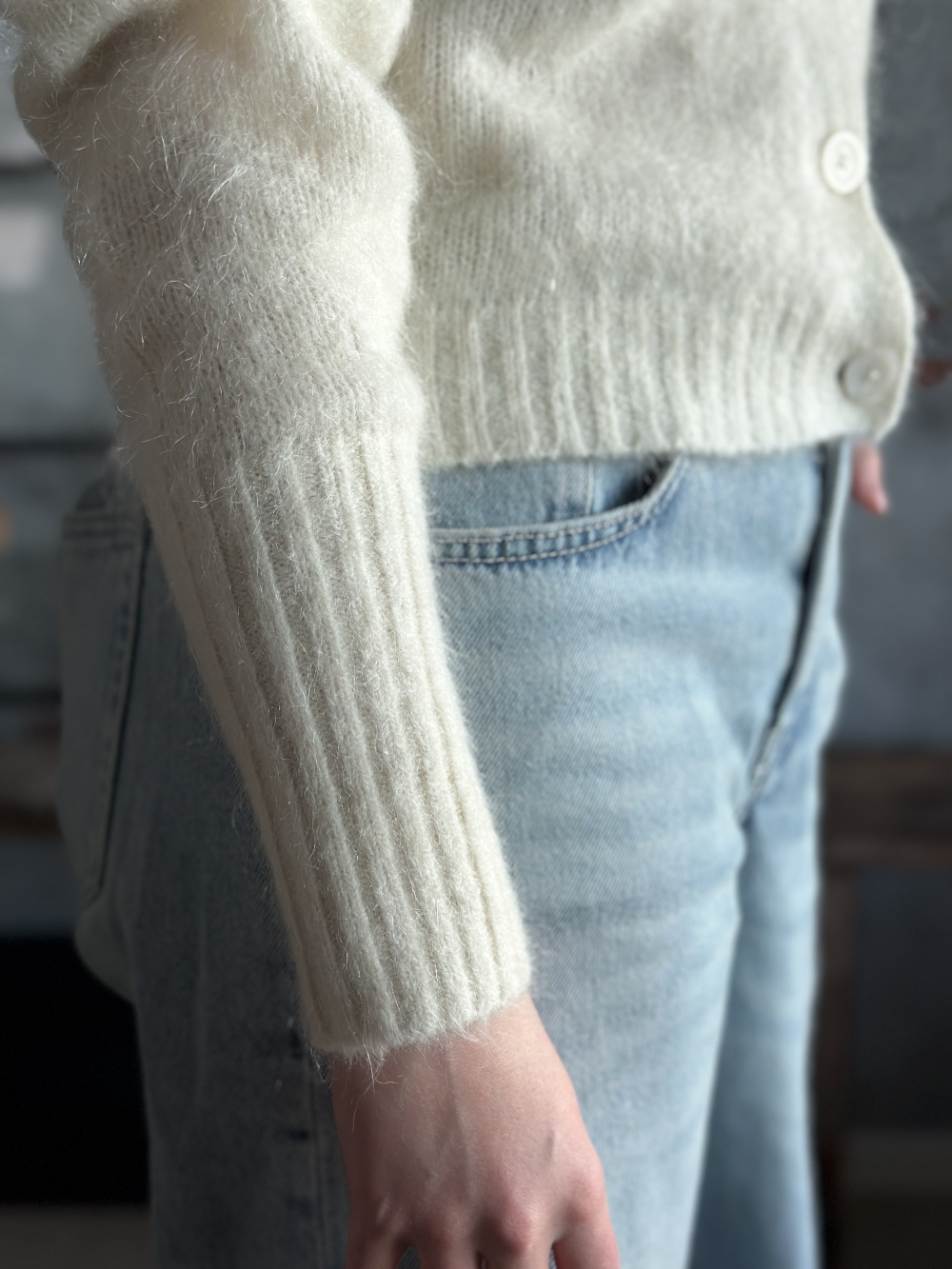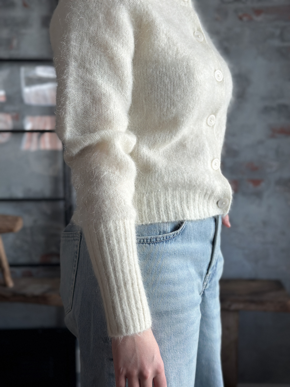 Laget av 34 % kidmohair, 34 % ull, 27 % polyamid & 5 % elastan
