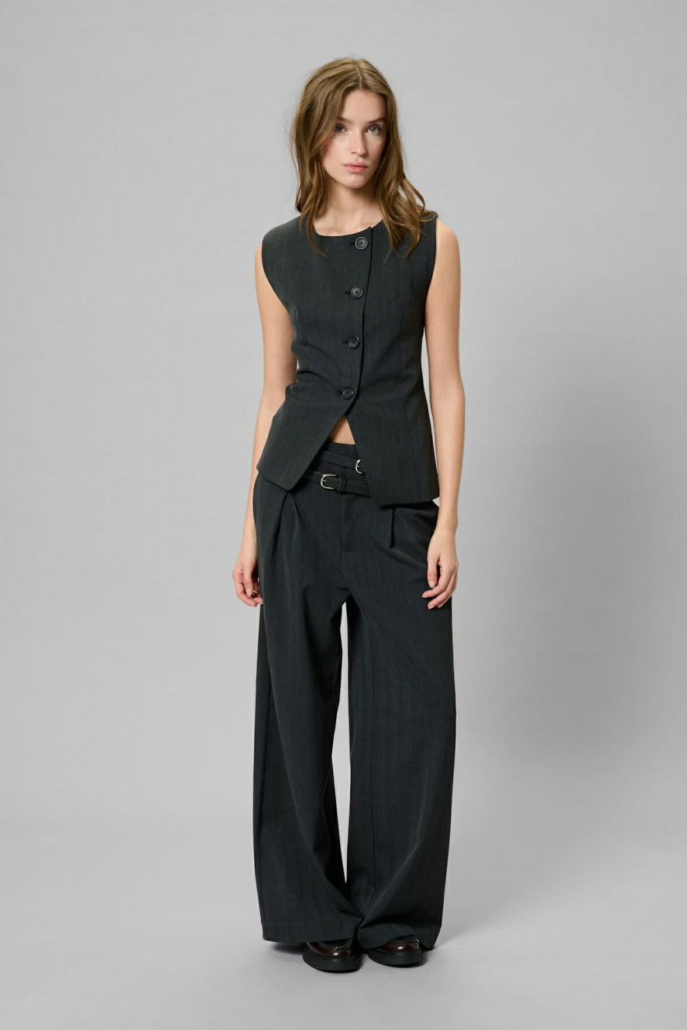 Vide bukser med høy midje, markerte folder og beltehemper gir et moderne, avslappet uttrykk. Full lengde og minimalistisk design.