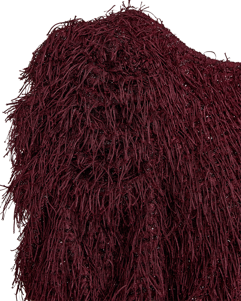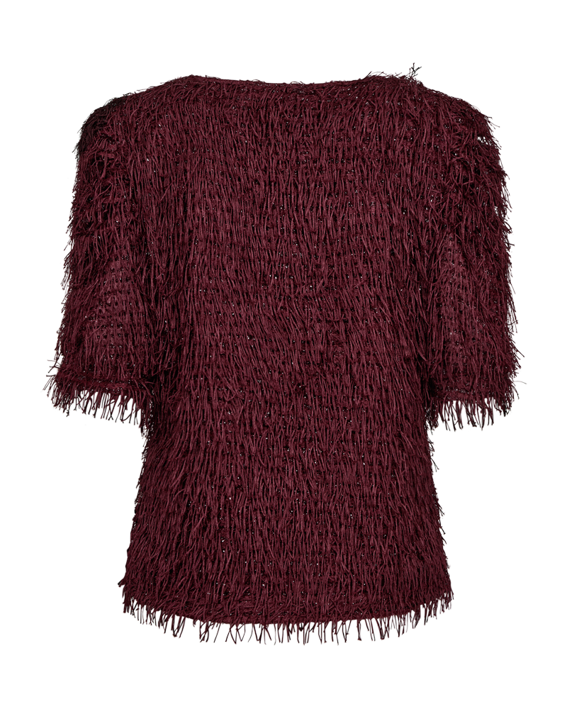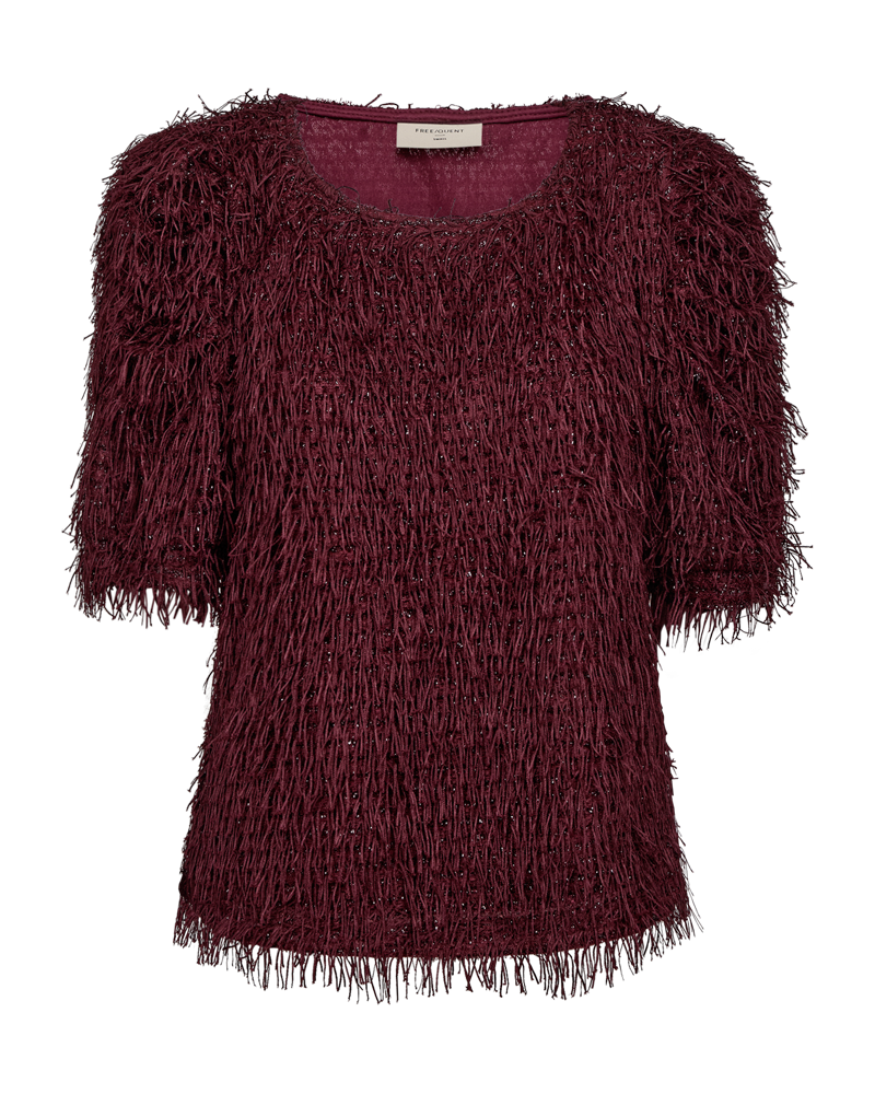 Elegant topp fra Freequent i stilig frynsestoff med glitter. Toppen har rund hals og korte ermer med en liten puff. Den er rett i fasongen og veldig behagelig å ha på. Normal i størrelsen.