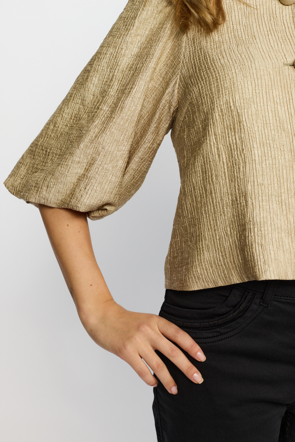 Nydelig jakke fra 2 BIZ i strukturert stoff med shimmer. Jakken lukkes med trekte knapper og har rund hals og puffermer som rekker over albuene. Den rekker til hoftene og har en elegant innsving. Like fin til bukse og skjørt som over kjole. Normal i størrelsen.