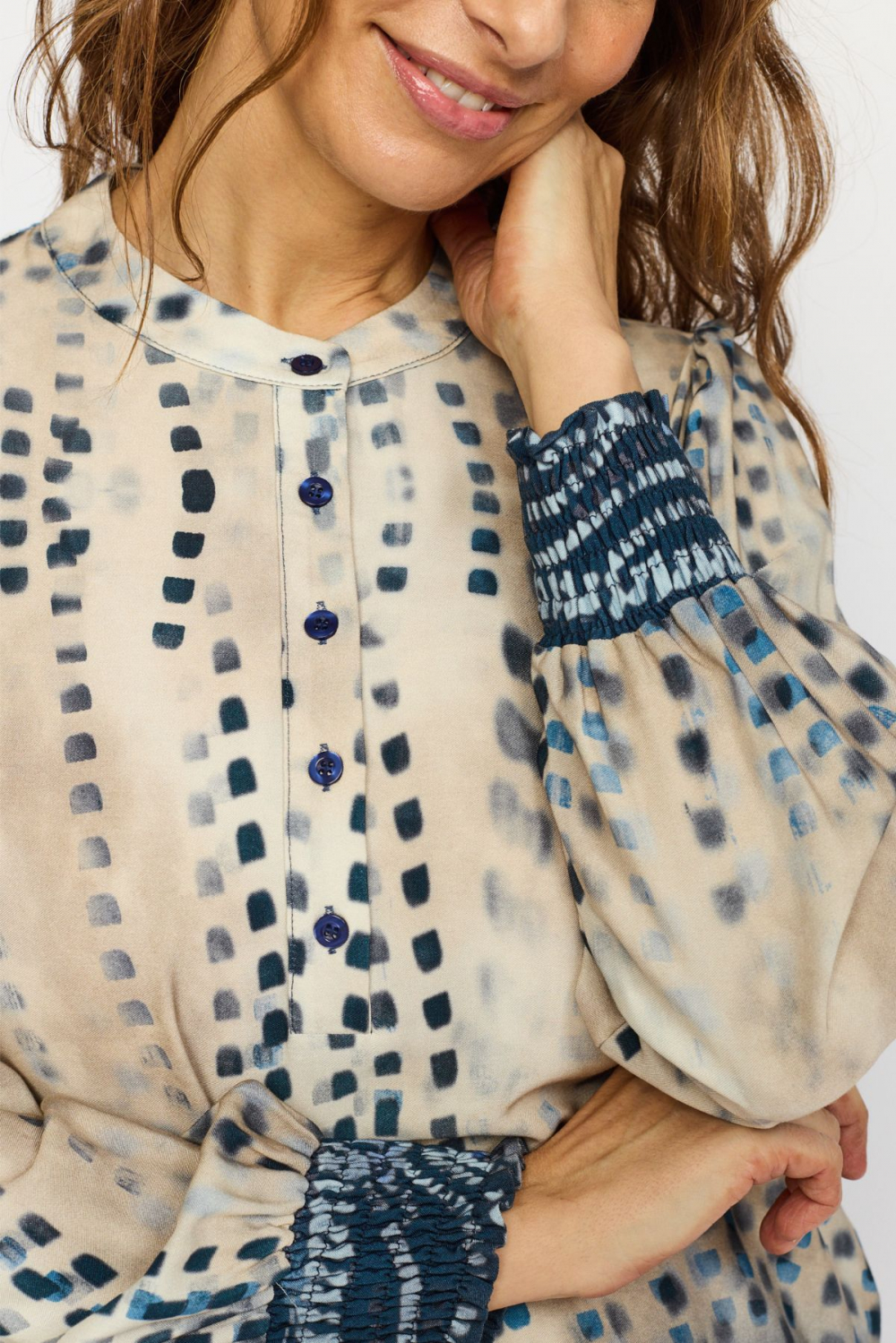 Bluse fra 2 BIZ i lett og luftig kvalitet. Blusen er rett i fasongen og rekker til hoftene. Den har rund hals med knappestolpe foran. Lange ermer med bred vaffelstrikk i kanten. Normal i størrelsen.