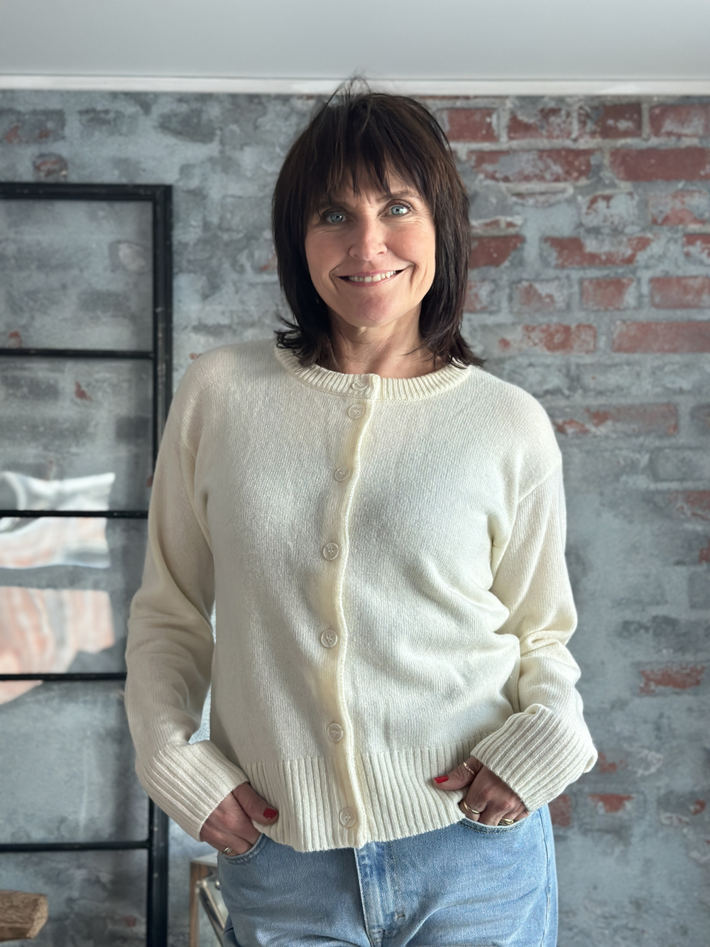 Klassisk cardiganjakke fra MEW i myk ullblanding. Jakken har en rett passform, rund hals og lange ermer. Ribbekant i halsen, på mansjetten og nede i linningen. Knappelukning gir allsidighet og komfort til både arbeid og fritid. Normal i størrelsen. Bente er 174 cm og har str. M