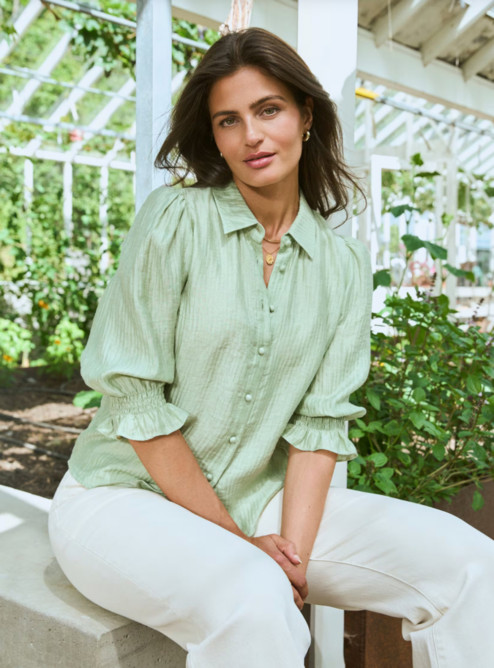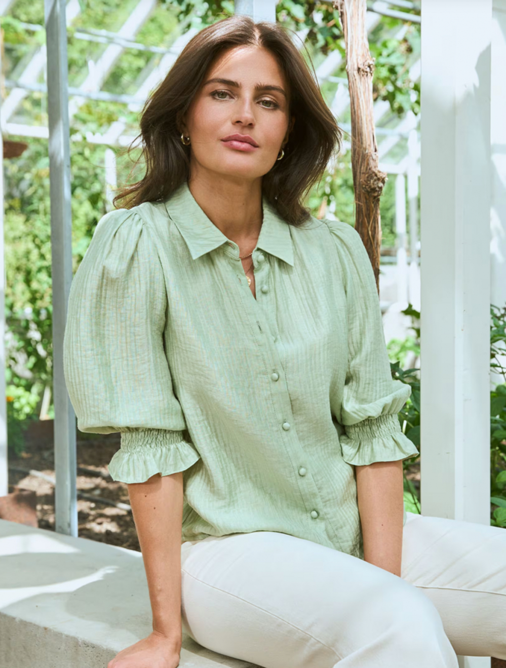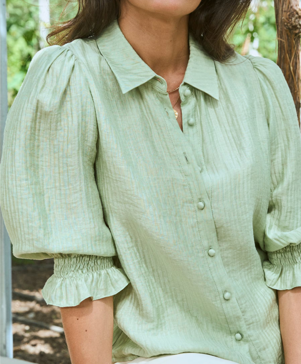 Bluse med lett glans fra Floyd i nydelig viskoseblanding. Blusen har elegante 3/4 - dels lange ermer med puff og strikk nede som gir en fin volangkant. Den har klassisk skjortekrage og lukkes med knepping. Normal i størrelsen