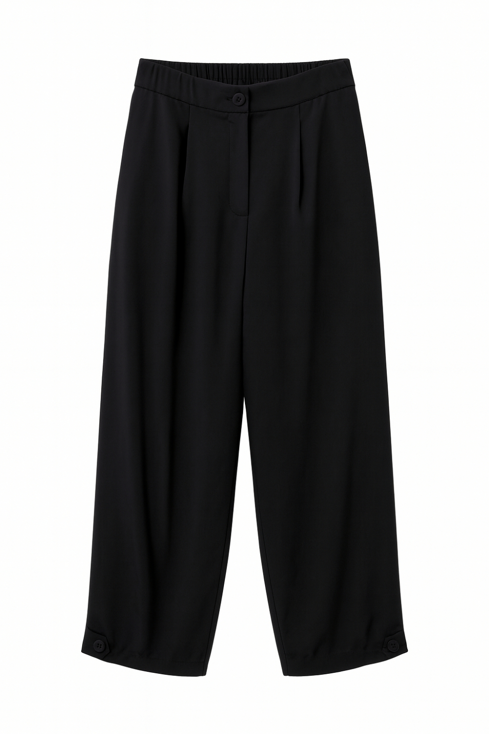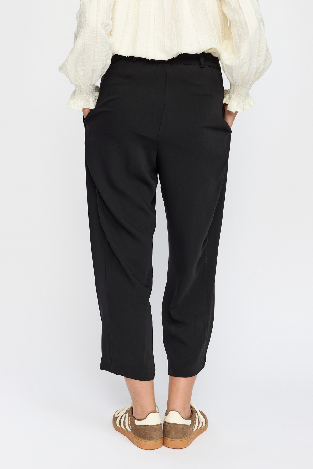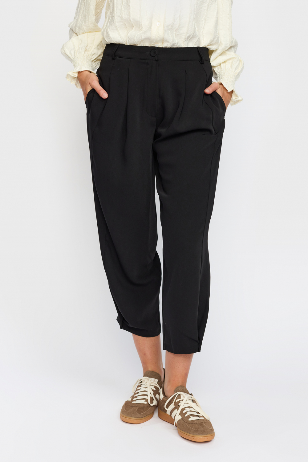 Stilig bukse fra 2BIZ i en glatt og behagelig kvalitet. Dette er en vid modell i "gulrot - fasong". Det betyr at den er vid over hoftene og smalner inn i bena. Lengden er 7/8 - dels og gjør den ekstra stilig til skoletter og pumps. Buksen har klassisk linning og lukkes med knapp og glidelås. Den har legg foran og stikklommer i siden. Normal i størrelsen.