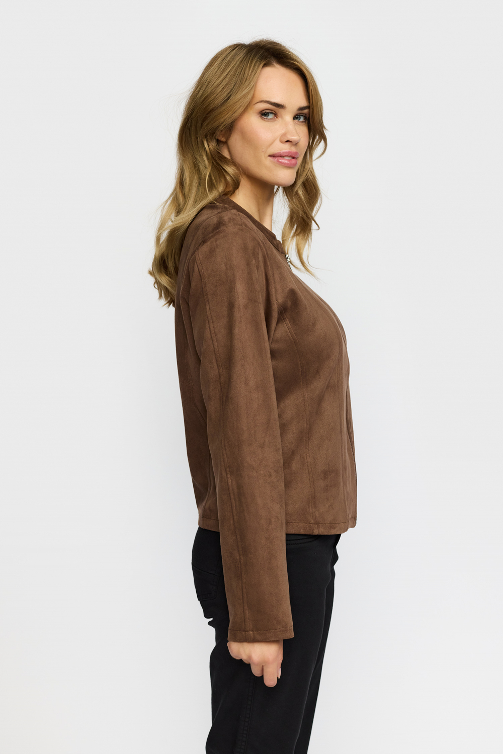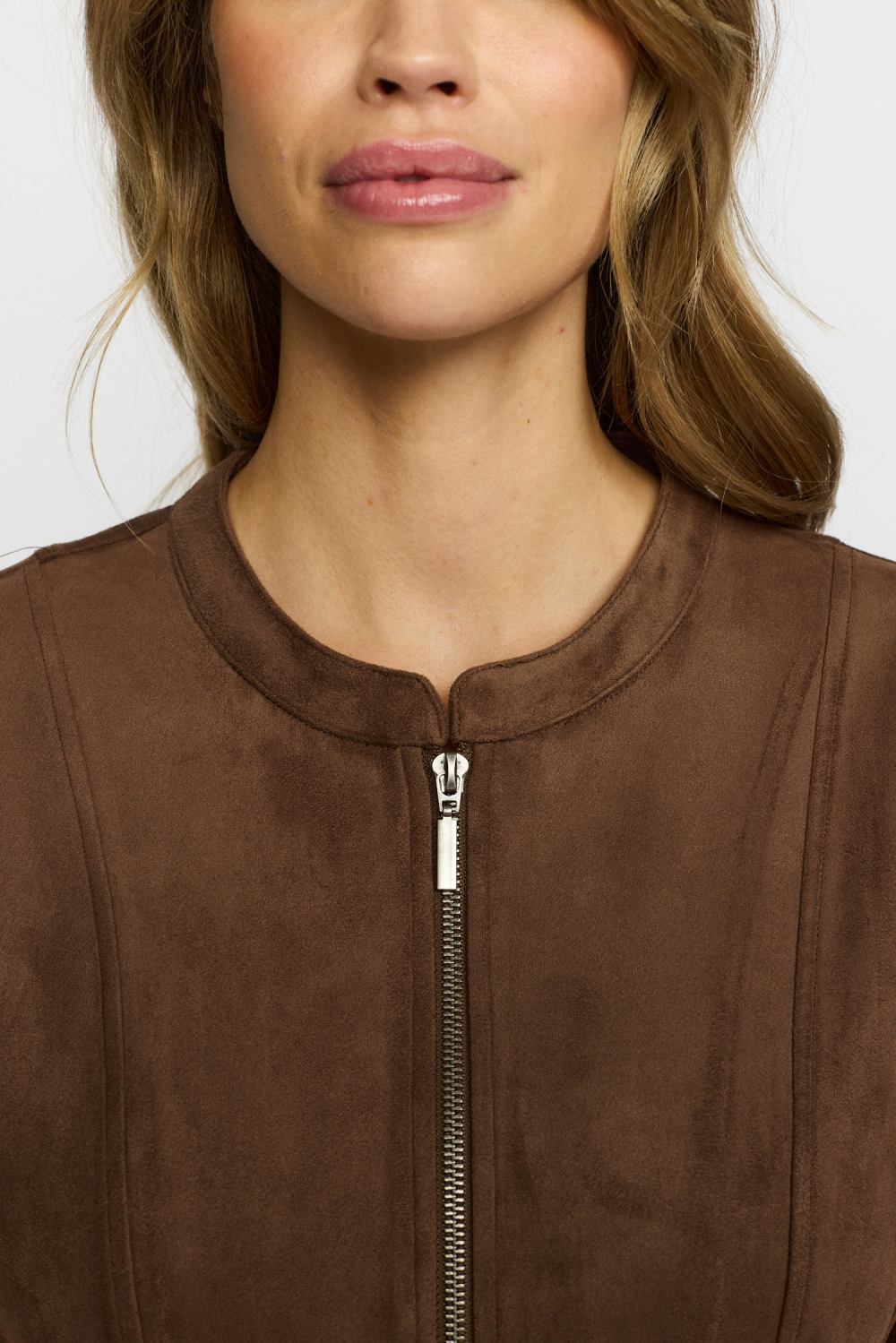 Jakke fra 2 BIZ i myk ruskinnslook-stoff. Jakken har rund hals og lange ermer. Den er fasongsydd og lukkes med glidelås foran. Behagelig å ha på. Normal i størrelsen.