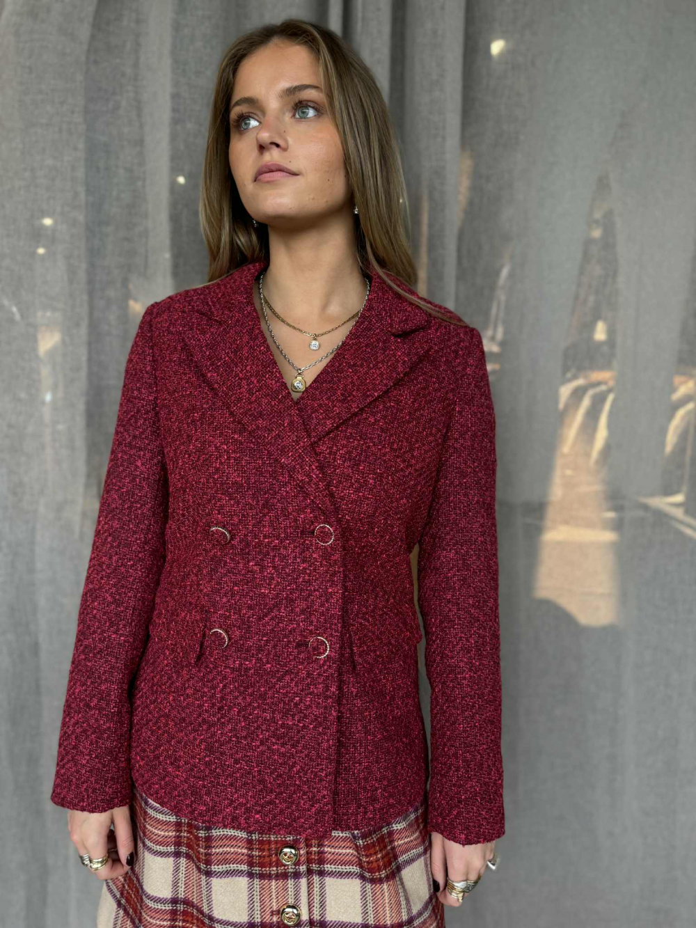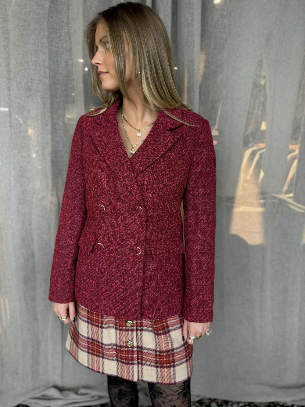 Gi garderoben din et løft med denne elegante bouclé-blazeren fra Y.A.S. Den klassiske dobbelknappede fasongen kombineres med et tidløst bouclé-stoff som gir et sofistikert og moderne uttrykk. Perfekt både til hverdags og fest.