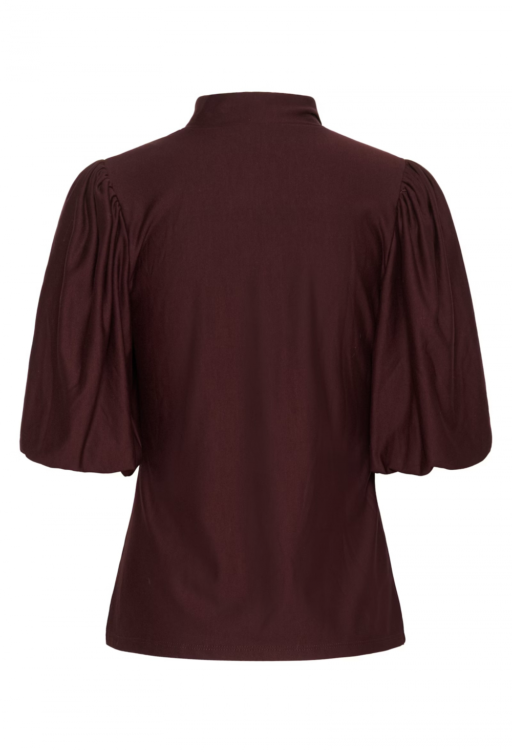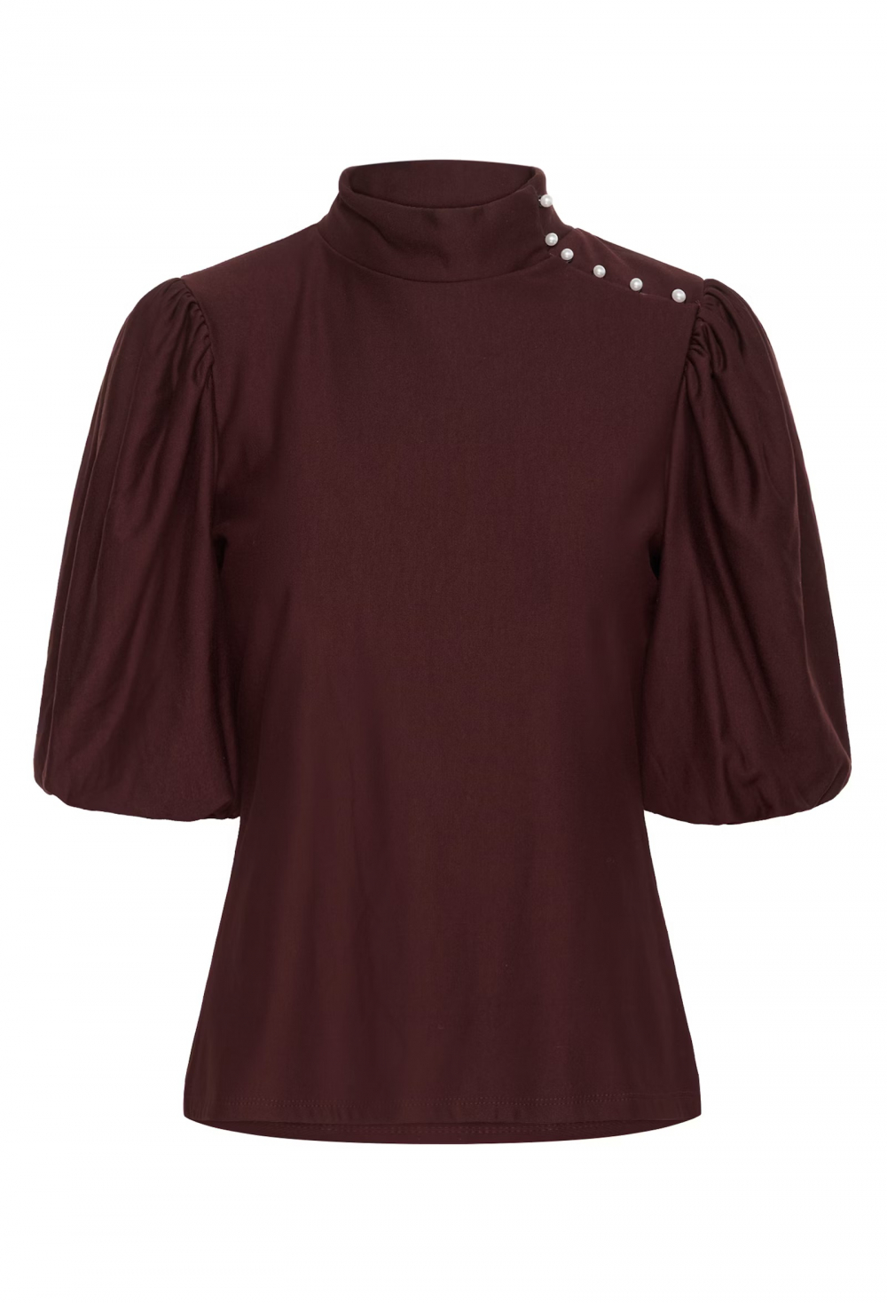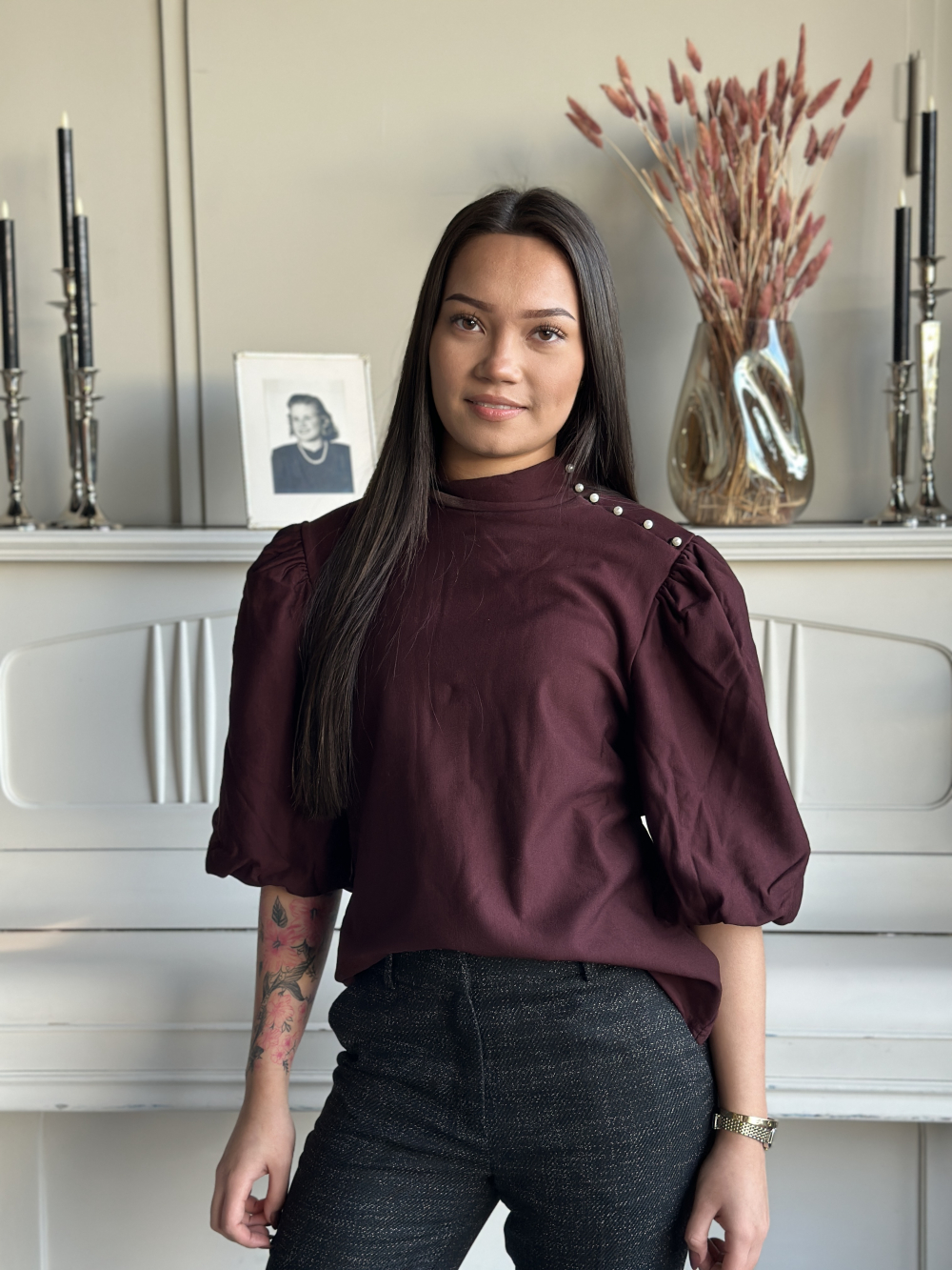 Topp med voluminøse halve ermer, høy hals og delikate perledetaljer på skulderen. Den har en strukturert silhuett som gir et elegant og feminint uttrykk. Perfekt både til hverdags og fest, like fin til jeans som til et pent skjørt. Detaljene gir plagget det lille ekstra, samtidig som passformen er flatterende og komfortabel.