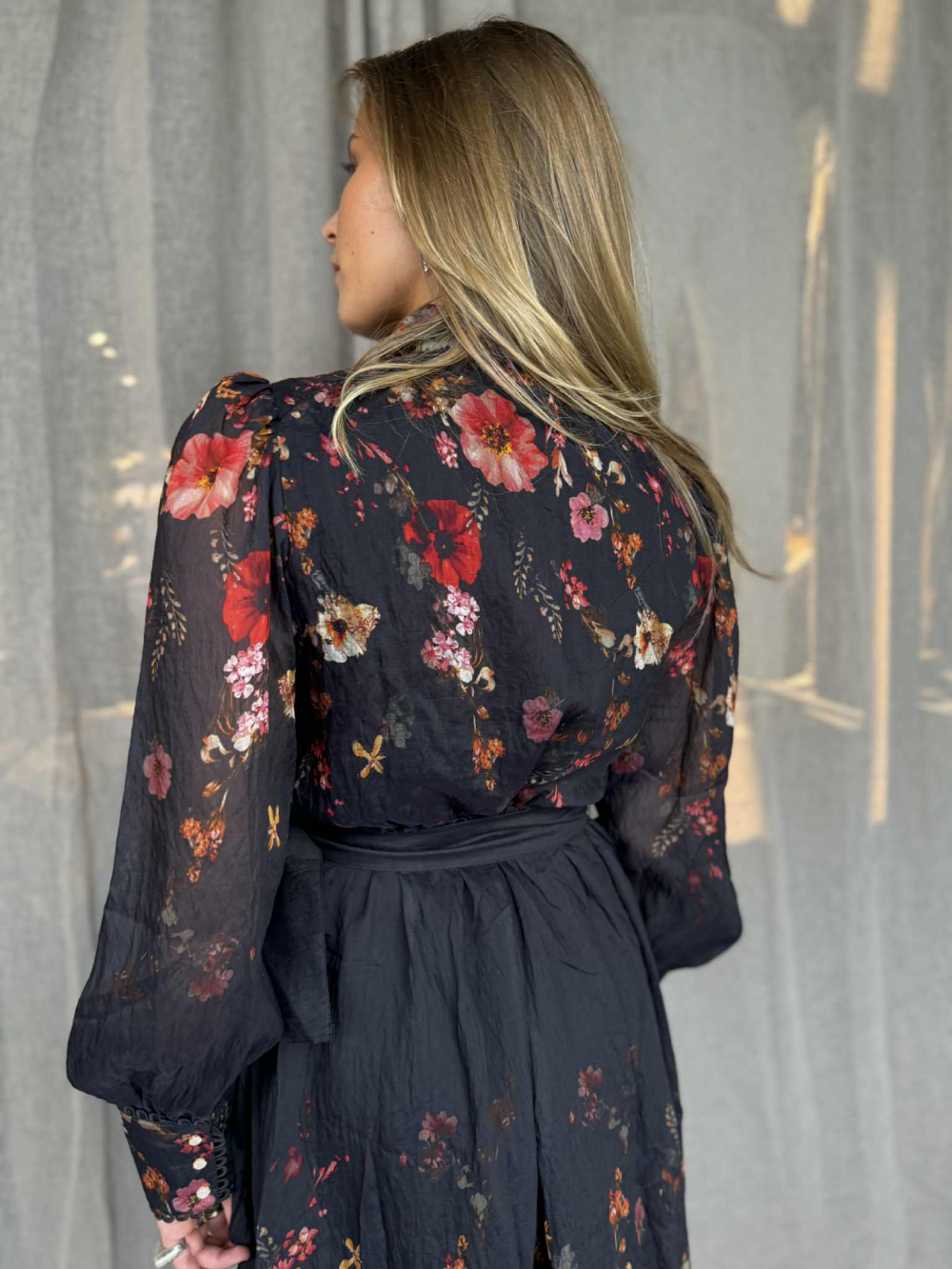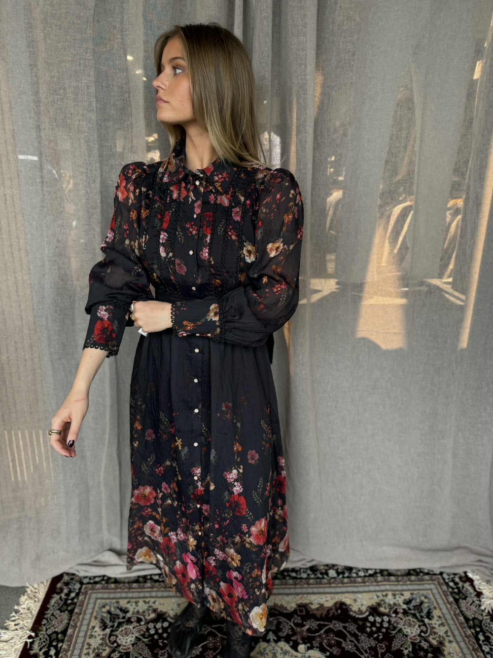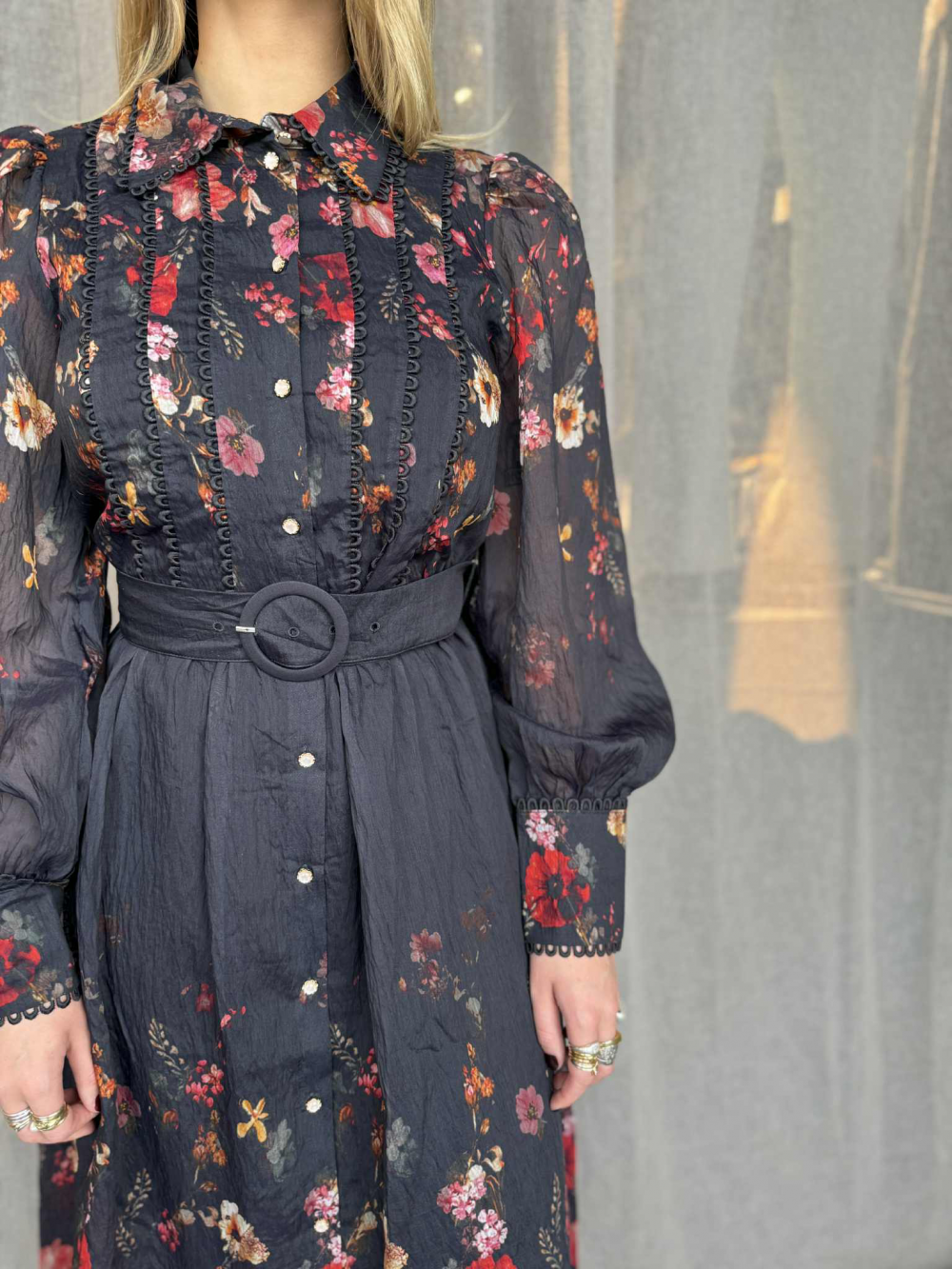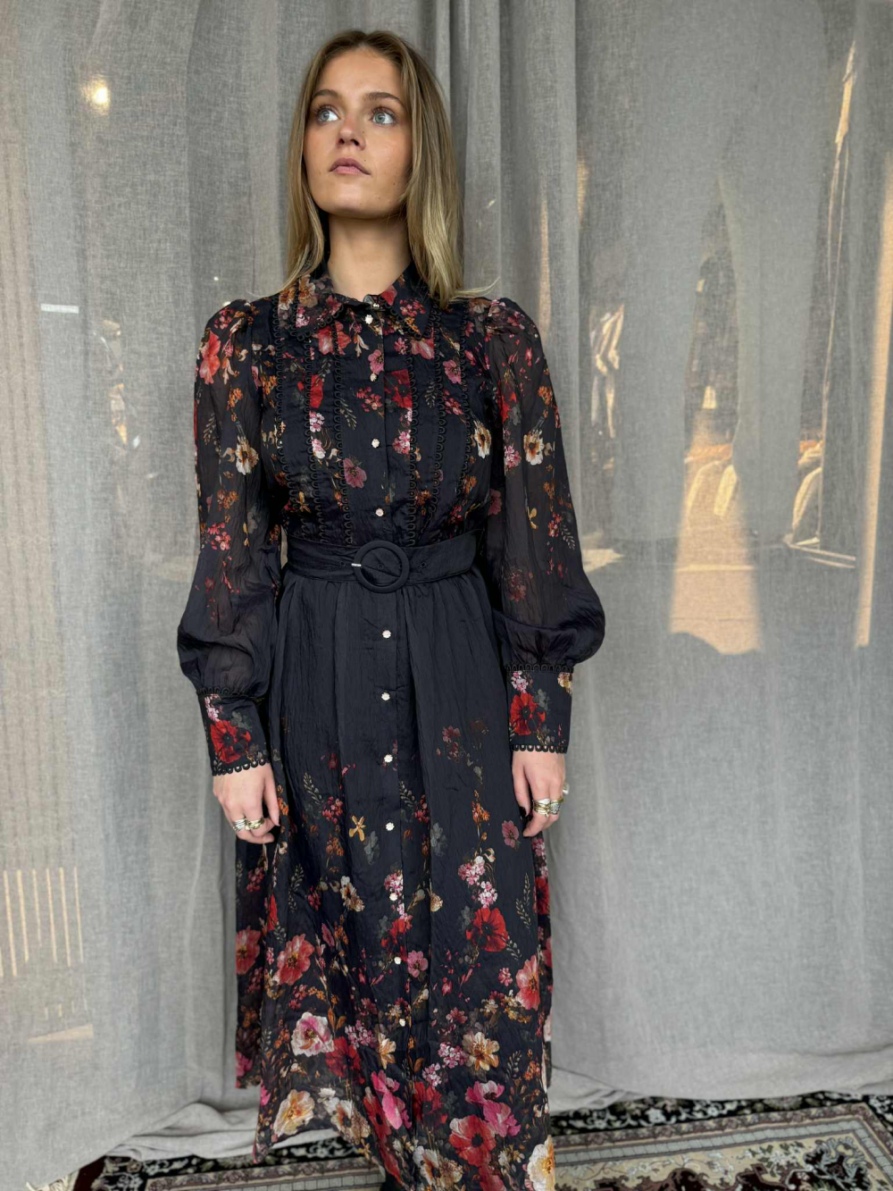 Denne feminine midikjolen fra YAS kombinerer et klassisk snitt med et romantisk blomsterprint. Kjolen har lange ermer med mansjetter, knappelukking foran og en markert midje med belte som gir en flatterende silhuett. Den mørke bunnfargen med fargerike blomster gjør den perfekt til både hverdags og festlige anledninger.