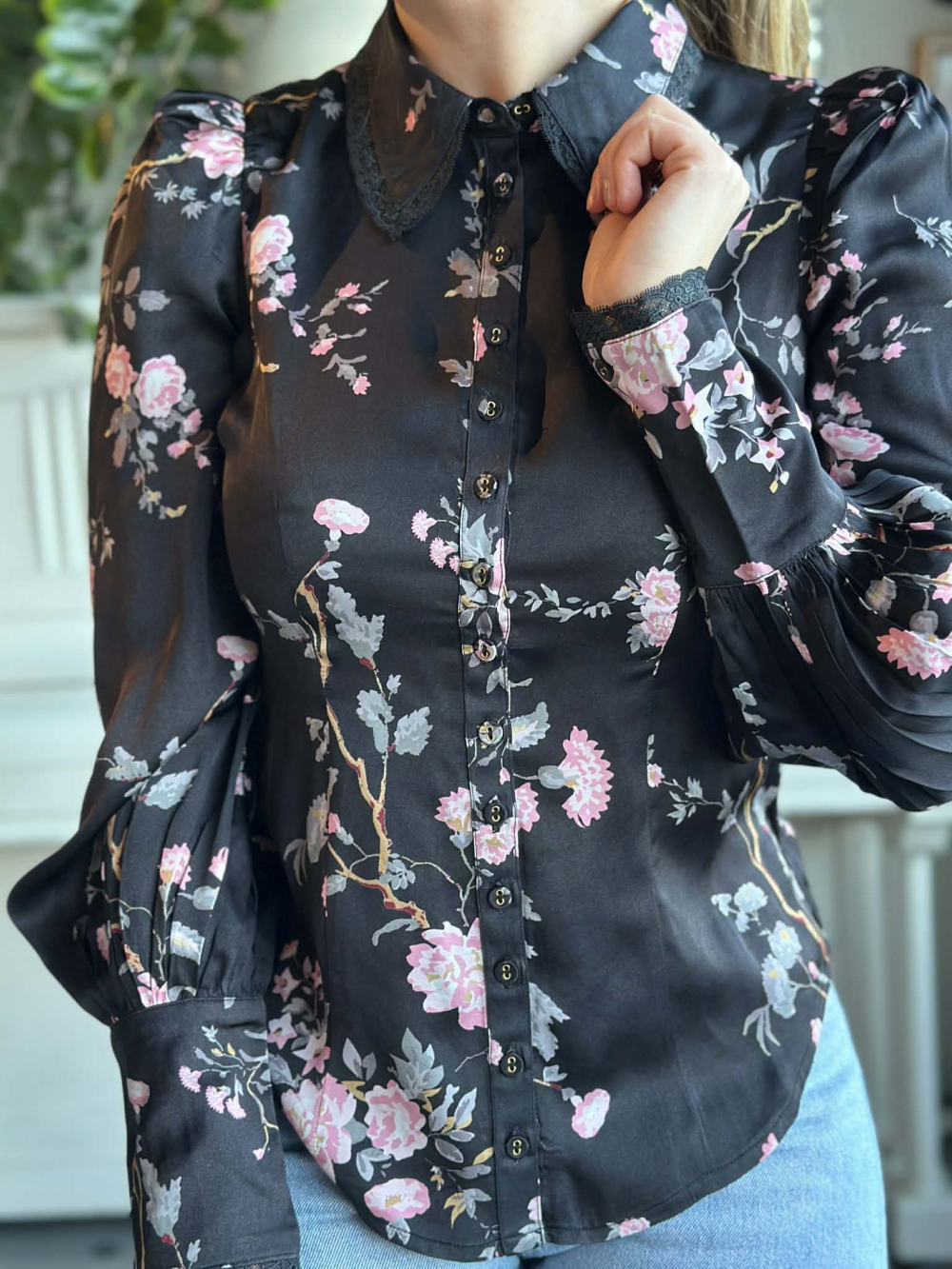 Satin Blouse er laget i glansfull og elegant FSC-sertifiserte viskosekvalitet. Blusen har en lett figurnær silhuett, lange ermer med firkantede mansjetter, skjortekrage og knapper hele veien ned foran. Kragen og mansjettene er pyntet med en delikat blondedetalj.