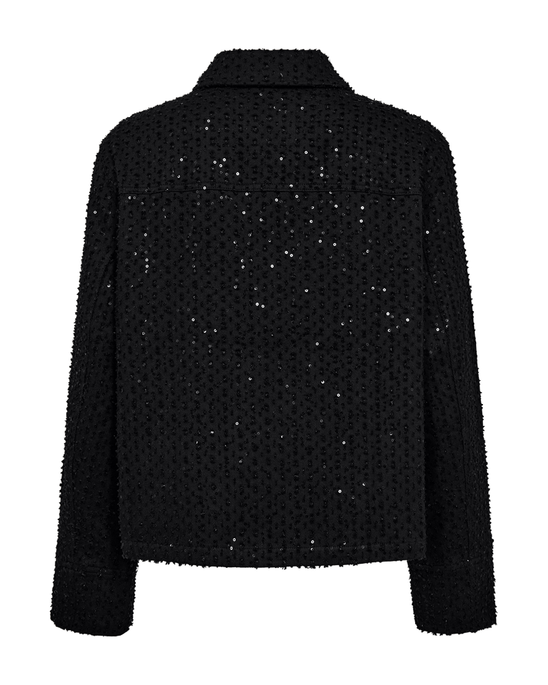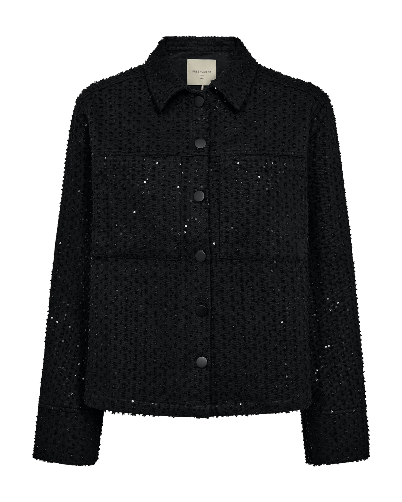 Stilig jakke fra Freequent i bomullskvalitet med paljetter. Jakken har klassisk skjortekrage og lukkes med knapper foran. Den er rett i fasongen og rekker til hoftene. Den er like fin å style over kjole som til bukse og skjørt. Normal i størrelsen.