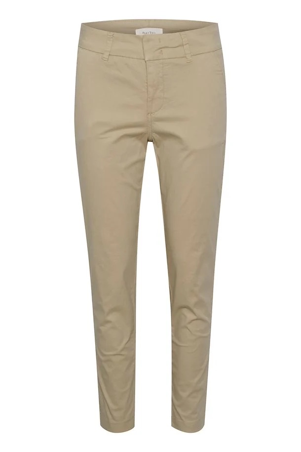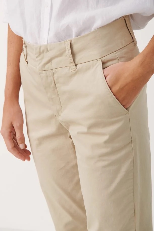 Favorittbuksen Soffys fra Part Two er tilbake i nye farger. Dette er en chinos med god stretch. Den er middels høy i livet og beina er smale, men ikke tettsittende. Stikklommer i sidene og falske passpolerte lommer bak. Ankellang. Buksen lukkes med to hekter, knapp og glidelås. Buksen er litt stor i størrelsen.