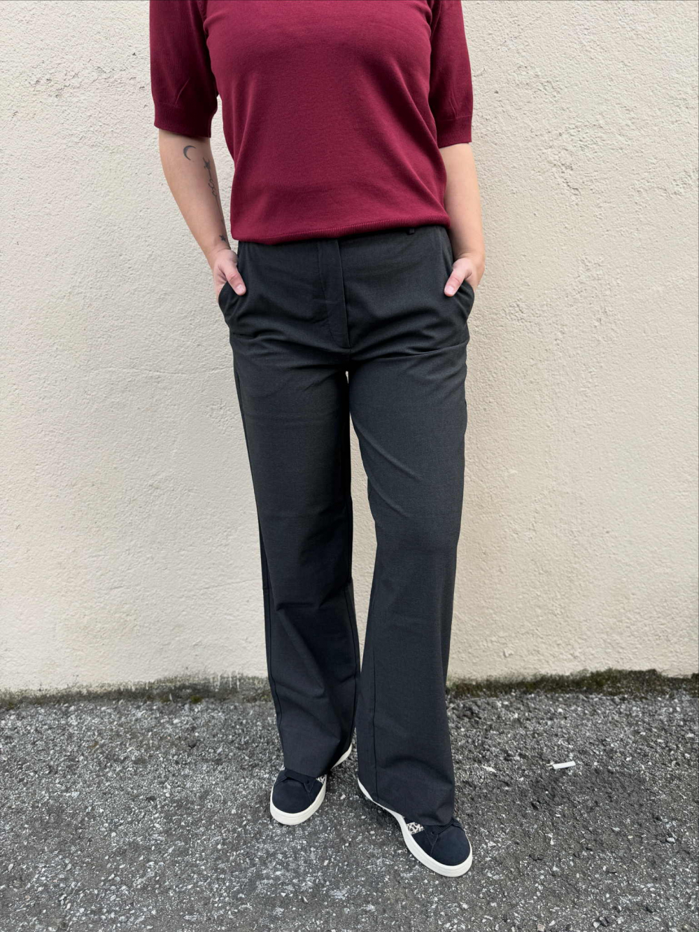 Sophia 871 Dark Grey Melange fra FiveUnits er en klassisk og stilfull bukse. Med høyt liv, bred linning og beltestropper, byr dette plagget på en fantastisk passform. Med stikklommer foran og elegante falske lommer bak, er det perfekt for hverdagsbruk eller festlige anledninger. Normal i størrelsen.