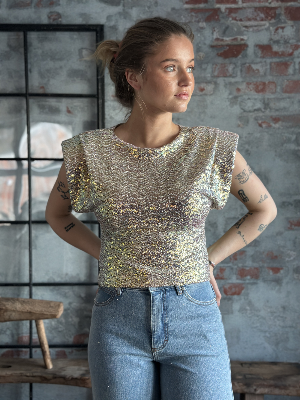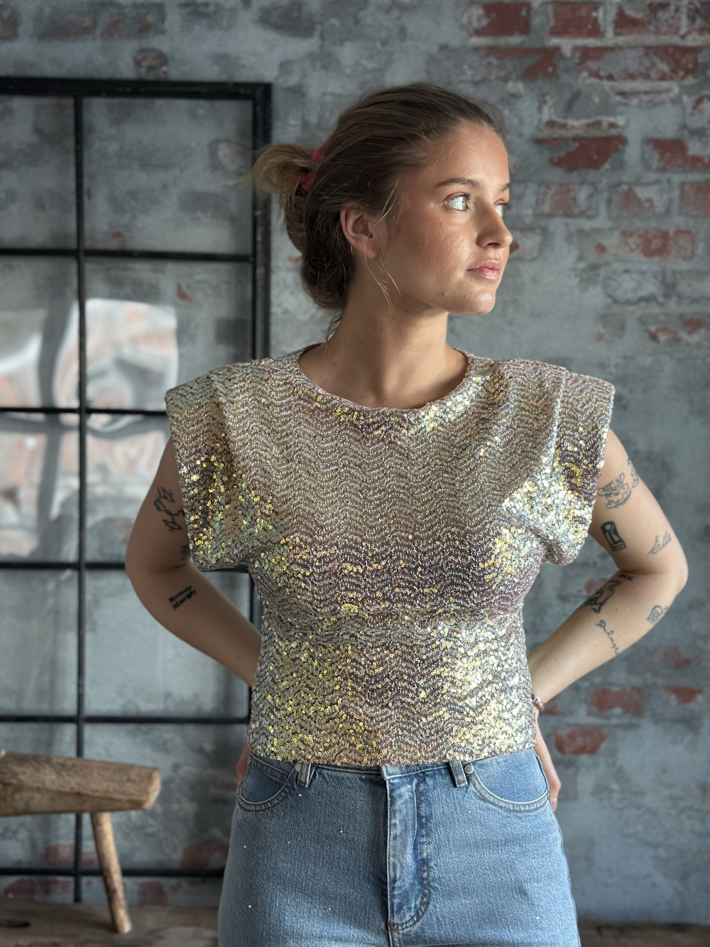 Glitrende ermløs topp fra Iben med paljetter. Toppen har rund hals med skulderputer i en figursydd passform. Dette er et statement - plagg du har hele året. Normal i størrelsen. Hedda er 165 cm og har str. XS.