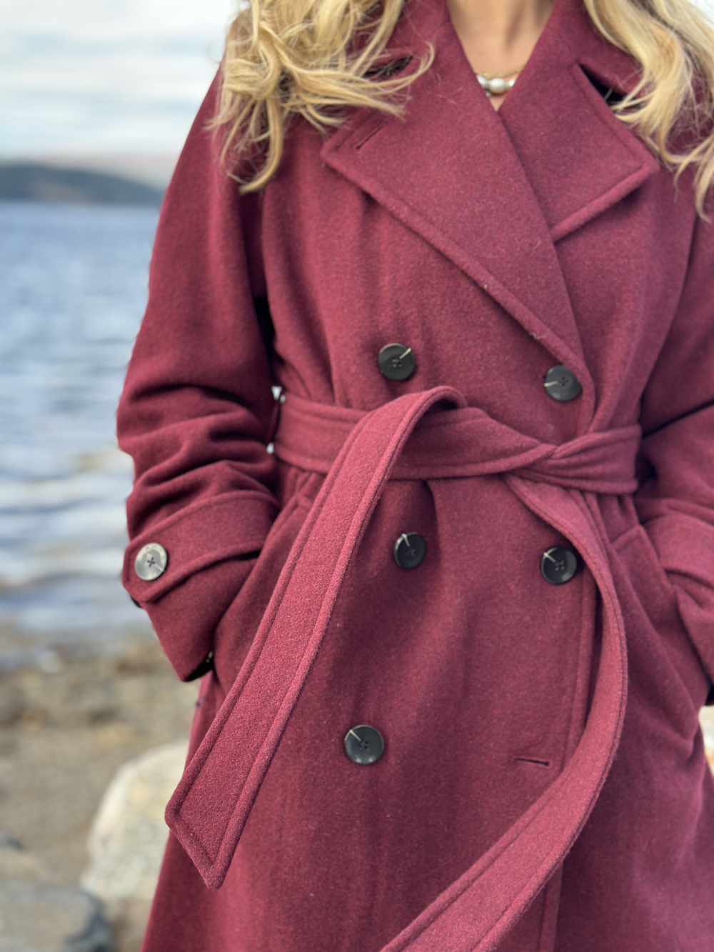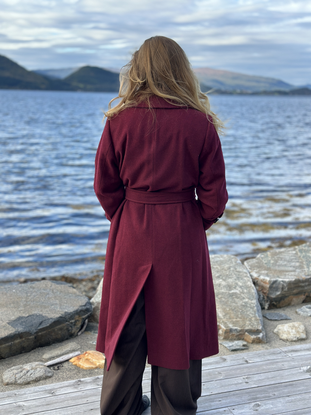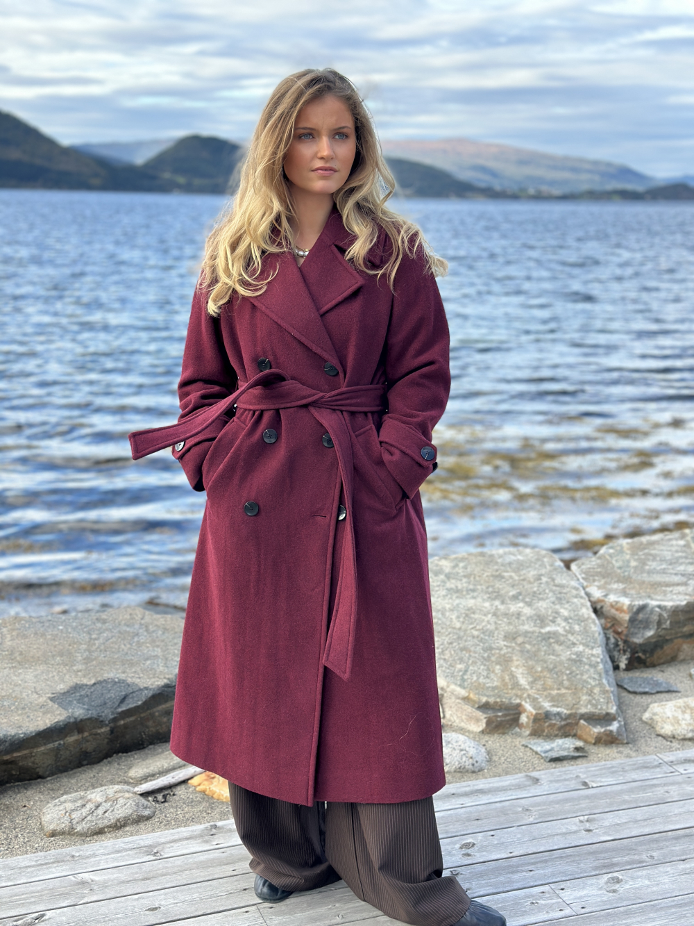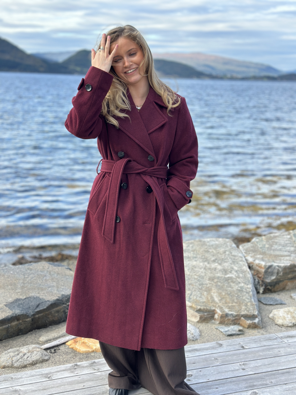 Elegant ullkåpe fra Part Two i nydelig burgunder. Med dobbeltspent design, brede jakkeslag og et matchende belte som fremhever midjen, gir den både struktur og varme. En allsidig garderobefavoritt – perfekt for både hverdagsbruk og spesielle anledninger. Normal i størrelsen. Hedda er 165 cm og har str. 36