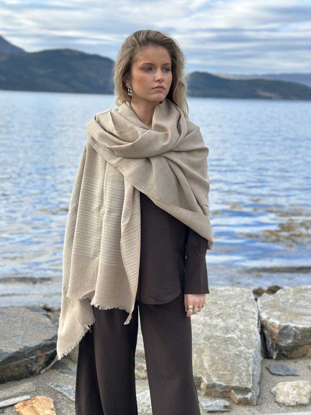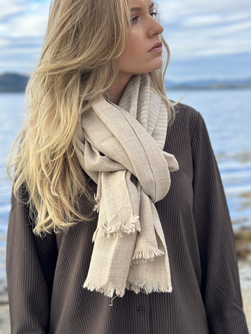 Nydelig melert beige farge med ton-i-ton striper.