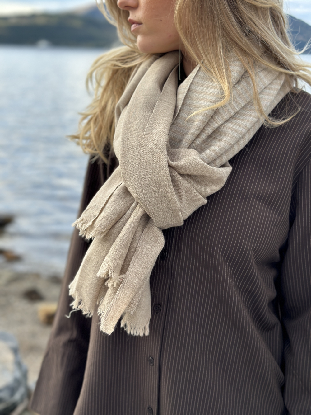 Deilig skjerf i ull fra vårt eget merke Passelé. Skjerfene er håndvevd av noen fabelaktige damer i India.