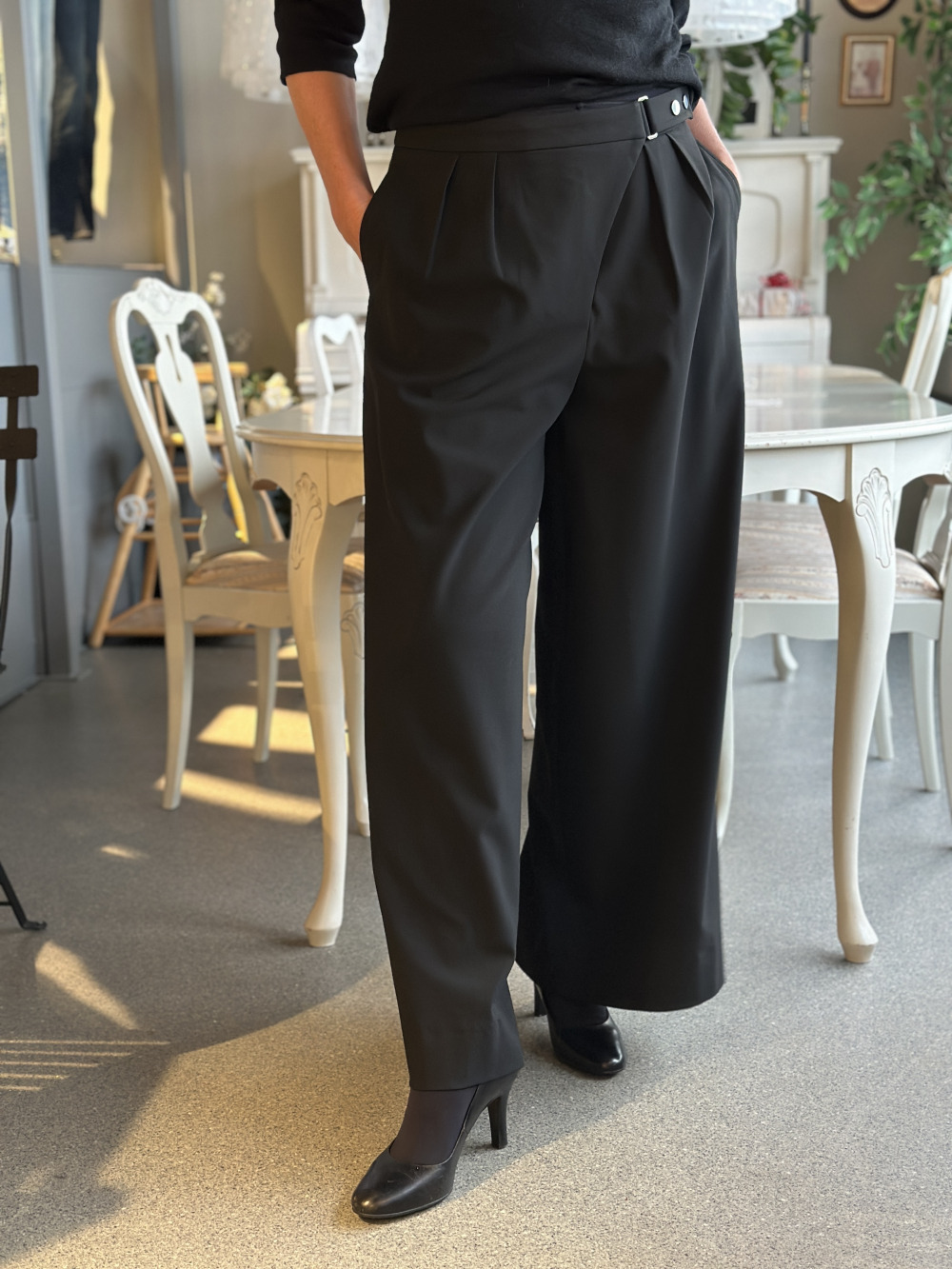 Stilig buksemodell fra Five Units i kvaliteten 285. Denne dressbuksen har en avslappet fasong med vide ben. Buksen har god høyde på livet med asymmetrisk lukking med spenne, trykknapper og glidelås. Stikklommer i siden og elegante legg foran. Normal til stor i størrelsen. Gå ned en størrelse på denne buksen. Bente er 174 cm og har str. 27