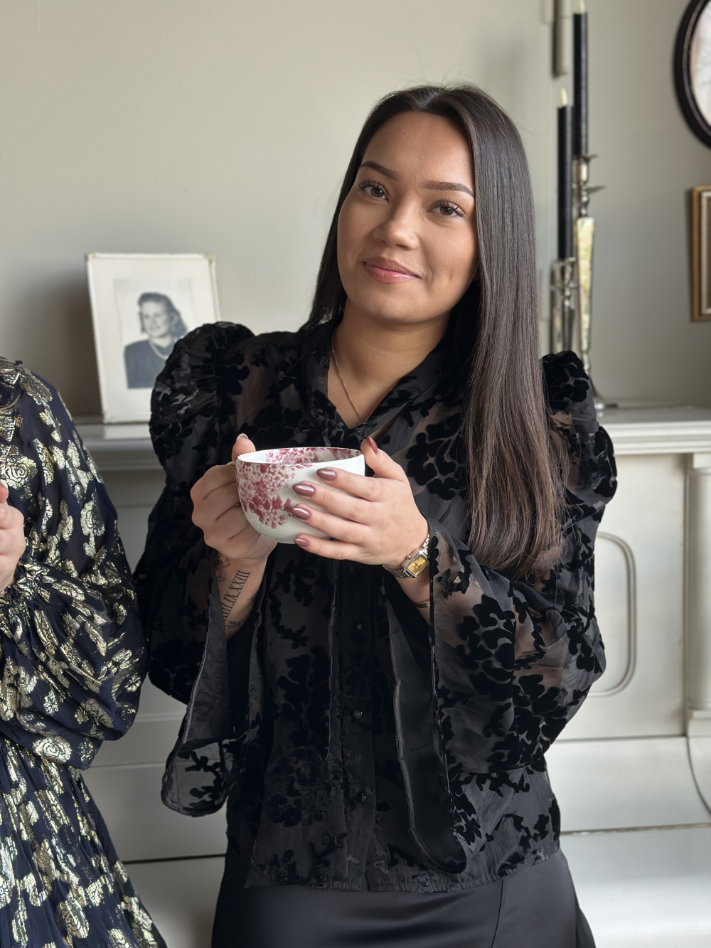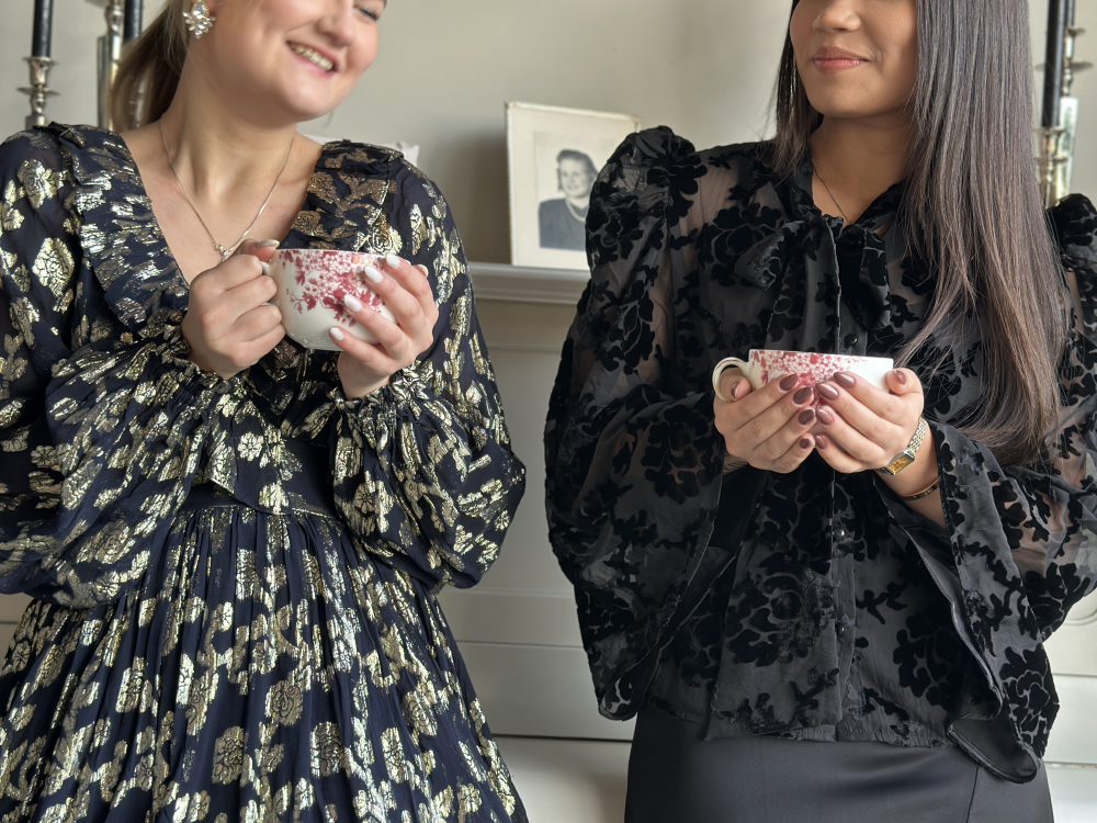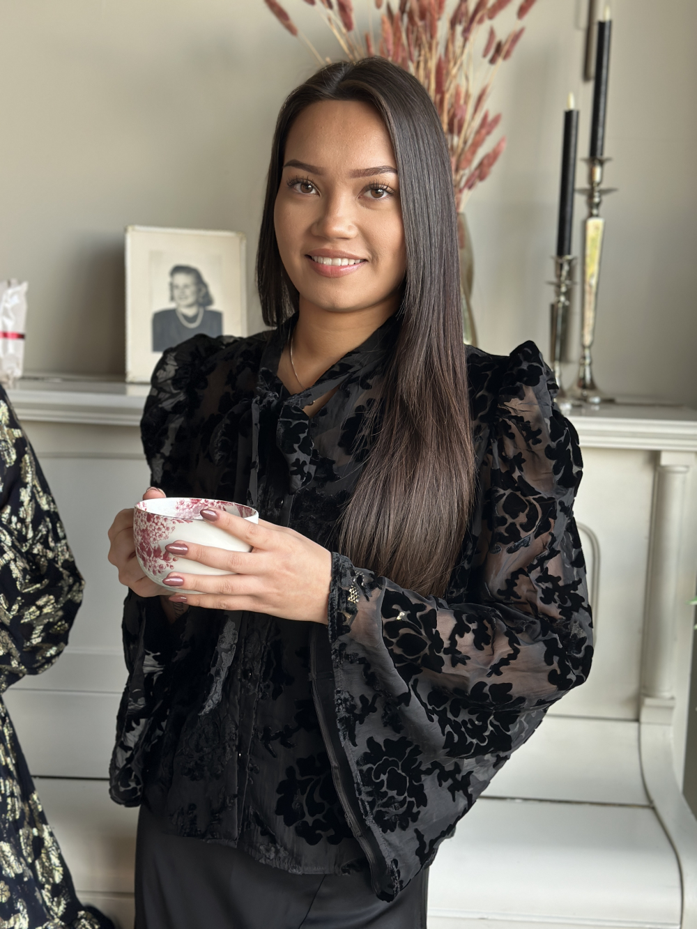 Nydelig bluse fra byTiMo i transparent kvalitet med velurblomster. Blusen har rundhals med bånd og lange trompetermer med en elegant puff. Den lukkes med knapper hele veien ned og kan brukes begge veier. Normal i størrelsen. Christina er 165 cm og har str. XS.