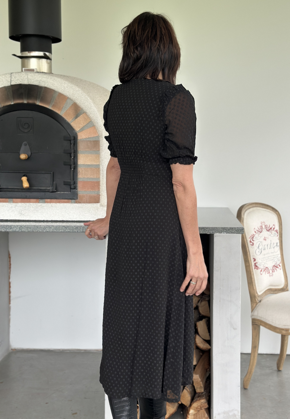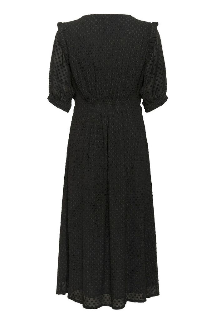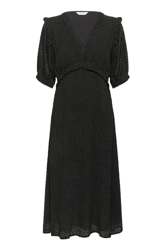 Midikjole fra Part Two i chiffong. Kjolen er foret i kroppen med transparente ermer. Den er innsvinget med strikk bak i ryggen. V-utringning med elegante volangdetaljer. Kjolen har korte ermer med strikk nede og små volager på skuldrene og under brystet. Tidløs kjole du har alle sesonger. Normal i størrelsen. Bente er 174 cm og har str. 38